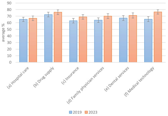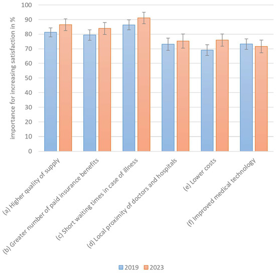 All optimization factors were perceived as similarly important, with a particular emphasis on waiting times, quality of treatment, and additional insurance benefits (Figure 6). The importance of satisfaction-related measures appears to have increased slightly in nearly all cases following the COVID-19 pandemic. However, the 2-sigma error margins overlap across all categories, indicating that these differences are not very large. The null hypothesis that service satisfaction in 2023 is less than or equal to that in 2019 was rejected through the one-sided t-test (p = 0.0048), indicating a significant increase over time. As no changes in the sense of deterioration were observed, Hypothesis H2b must be rejected. The slight increase in the relative importance of satisfaction measures shows that the importance of the healthcare system is perceived as more sensitive and, therefore, more important.