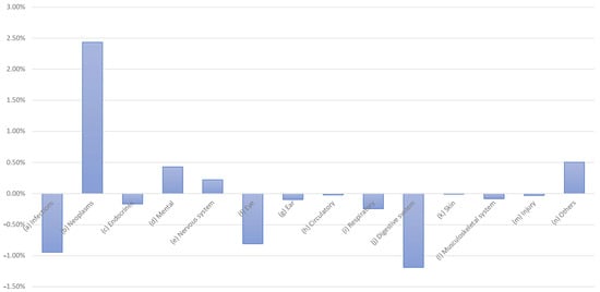 Reductions are particularly evident for infections, eye care, and digestive system conditions, while increases can be observed for neoplasms and the treatment of psychological, nervous system, and “other” diseases.