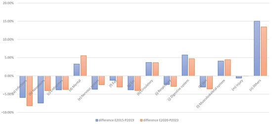 To identify the concrete differences between the allocation preferences (P) and the actual expenditure (E), the corresponding pre- and post-COVID-19 differences (i.e., E2015–P2019 and E2020–P2023) were compared (Figure 9). Here, negative values indicate that the proportional preferences are higher than the actual expenditure and vice versa.