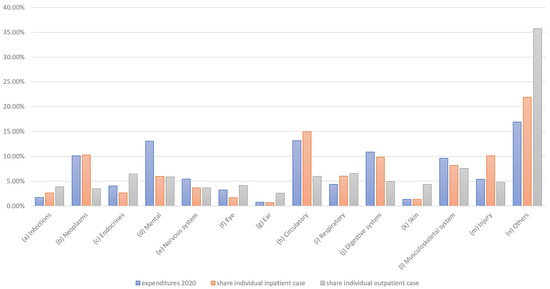 Next, the demand-oriented allocation preferences determined in this study were compared to the actual supply-oriented distributions of healthcare expenditure per illness. Expenditure data were available for approximately three years before the preferences were collected. The distribution of total healthcare expenditure, determined from Gesundheitsberichterstattung des Bundes (GBE, federal healthcare reporting) data, is shown in Figure 7.