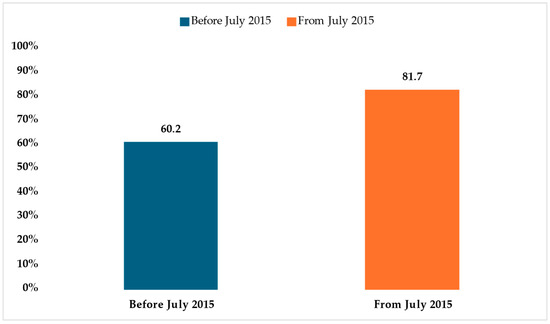 This study included a total of 229 patients, of whom 98 (42.8%) received treatment before July 2015. During this earlier period, the emergency department recorded an incidence of 228.2 cases per 100,000 patients out of a total of 42,952 visits. The remaining 131 patients (57.2%) were treated after July 2015, corresponding to an increased rate of 366.3 cases per 100,000 patients among 35,765 emergency department visits (Table 1).