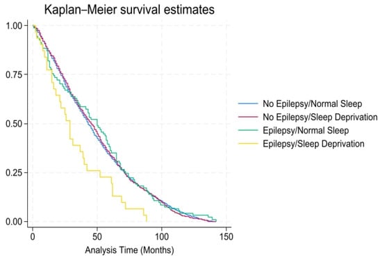 The multivariable analyses were weighted using the NHIS-provided weights. We calculated the HR with a 95% confidence interval (CI) for all-cause mortality using Cox proportional hazard regression models. Because our mortality outcome was binary, we used unadjusted and adjusted complex sample Cox regression models for the analysis to predict mortality. Categorical variables were expressed as percentage values and analyzed using chi-square testing. For each participant, the person-time was calculated as the time from the baseline survey participation interview date until the date of death or end of follow-up (31 December 2019), whichever came first. Separate models for sleep deprivation versus all-cause mortality were run by epilepsy status. Additionally, the potential effect of various individual-level differences was analyzed after adjusting for sociodemographic and health factors, estimating variances using the Taylor series linearization method. Individuals surviving beyond the follow-up period were treated as right-censored observations. Additionally, survival curves were generated using the Kaplan–Meier product-limit method to estimate the percent survival of the subject at each point in time. We used Stata 16 for all data management and statistical modeling.
