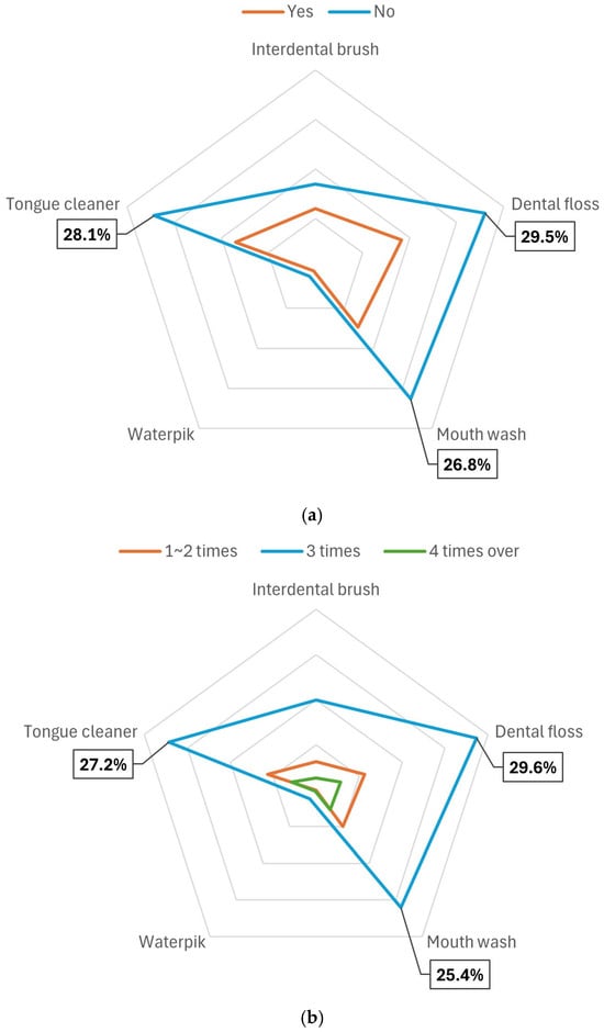 Figure 2 shows the differences in the use of oral hygiene aids according to gingival bleeding, average daily tooth brushing frequency, and stress levels among individuals who perceived their oral health as healthy. The rate of use of oral hygiene aids was highest when there was no gingival bleeding, when the average daily tooth brushing frequency was three times, and when stress levels were low. Dental flosses, tongue cleaners, and mouthwashes were the most frequently used oral hygiene aids.