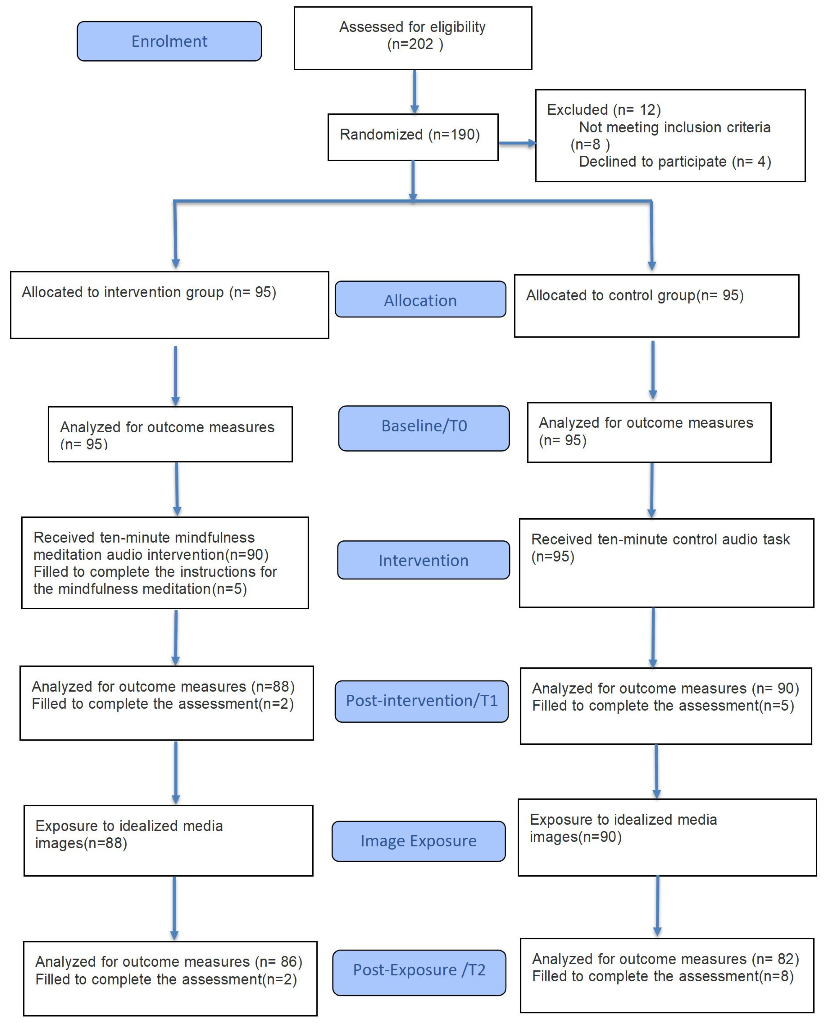 We conducted an online randomized controlled experiment. Using purposive sampling, participants who met the eligibility criteria were recruited via advertisements posted on the first author’s personal Xiaohongshu account. Participants were randomly assigned to either the mindfulness intervention or a control group. Those in the intervention group listened to a ten-minute mindfulness audio, and those in the control group listened to a matched ten-minute natural-history recording. After completing their respective audio sessions, participants viewed idealized body images from a researcher-curated Xiaohongshu profile and subsequently compared themselves to these images. Outcome variables were measured at baseline (T0), post-intervention (T1), and post-exposure (T2). The study was conducted in accordance with the Declaration of Helsinki and was approved by Ethics Committee of School of Language and Communication, Beijing Jiaotong University (approval code: BJTU2025060501). This trial was registered in the Chinese Clinical Trial Registry (registration no. ChiCTR2500104893) on 25 June 2025. The randomized trial was reported in line with the CONSORT guidelines [
