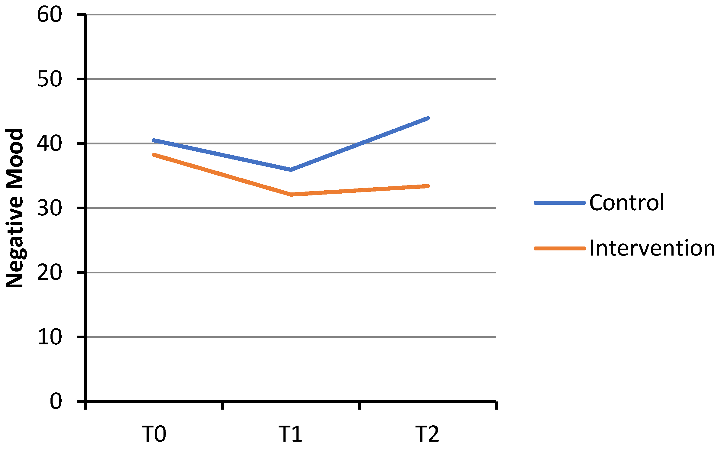 Primary analyses were conducted using generalized linear mixed models (GLMM) to examine whether changes in state body dissatisfaction and negative mood over time differed by condition. Two separate models were specified to examine the effects on each of these two outcome variables. To measure differences in the rate of change from T0 to T2, time was coded into two dummy variables. The first dummy variable captured the contrast between T0 and T1 (T0 coded as 1, T1 as 0); the second dummy variable captured the contrast between T1 and T2 (T1 as 0, T2 as 1). Condition (Intervention group vs. Control group) and its interaction with time were included as predictors in each model. This analytical approach enabled the examination of the rate of change in the outcome variables over time, as well as differences in this rate between groups. To further investigate the interaction between condition and time, simple effects of time within each condition were examined. The condition variable was re-coded in two ways (first coding the control group as 0 and the intervention group as 1, then reversing the coding), so each group served as the reference category in one of the analyses. This design enabled a separate evaluation of within-group changes in both the intervention and control groups. Effect sizes for these changes were calculated as Cohen’s d. Estimates of the fixed effects from these models were reported below.