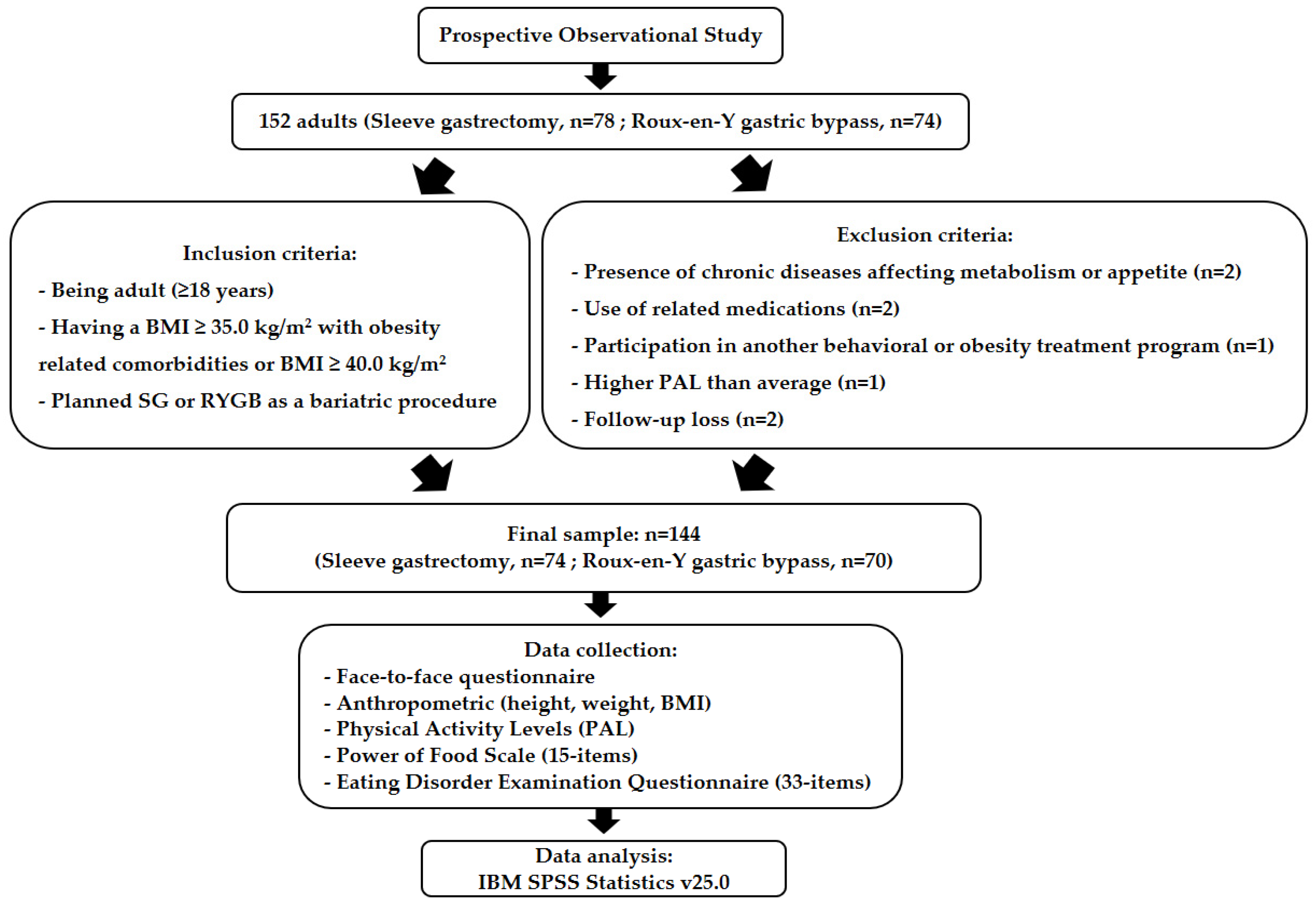 - Conceição, E.M.; Mitchell, J.E.; Pinto-Bastos, A.; Arrojado, F.; Brandão, I.; Machado, P.P. Stability of problematic eating behaviors and weight loss trajectories after bariatric surgery: A longitudinal observational study. Surg. Obes. Relat. Dis. 2017, 13, 1063–1070. [Google Scholar] [CrossRef]