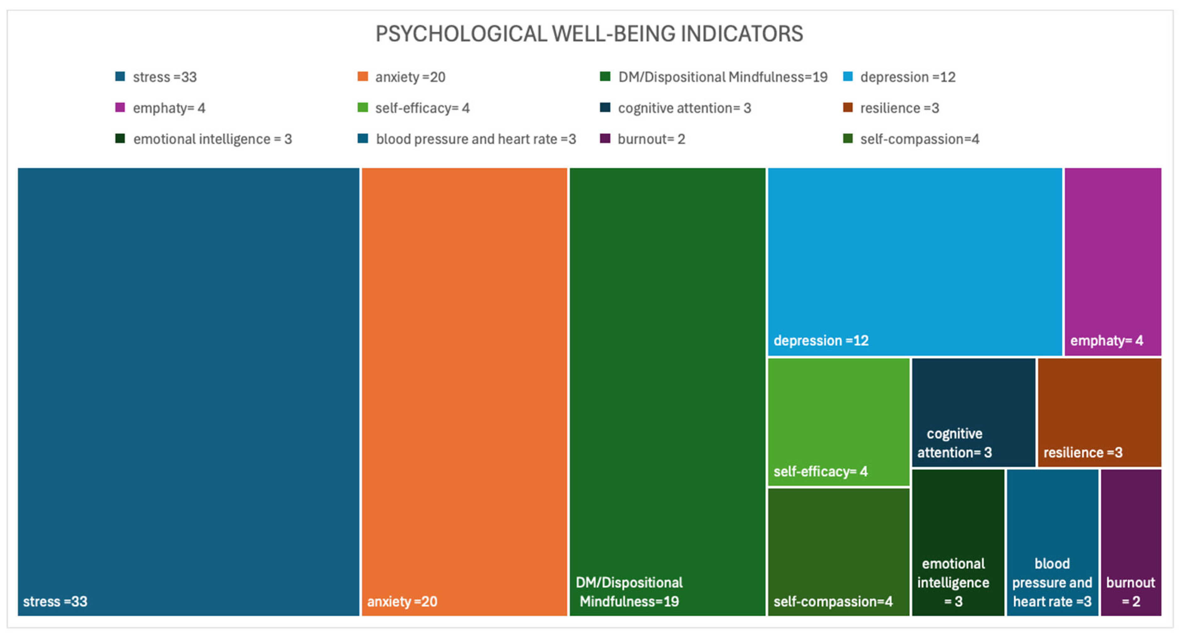 - The majority of studies focus on reducing psychological distress, whereas outcomes related to positive psychological well-being and core nursing competencies remain underexplored.