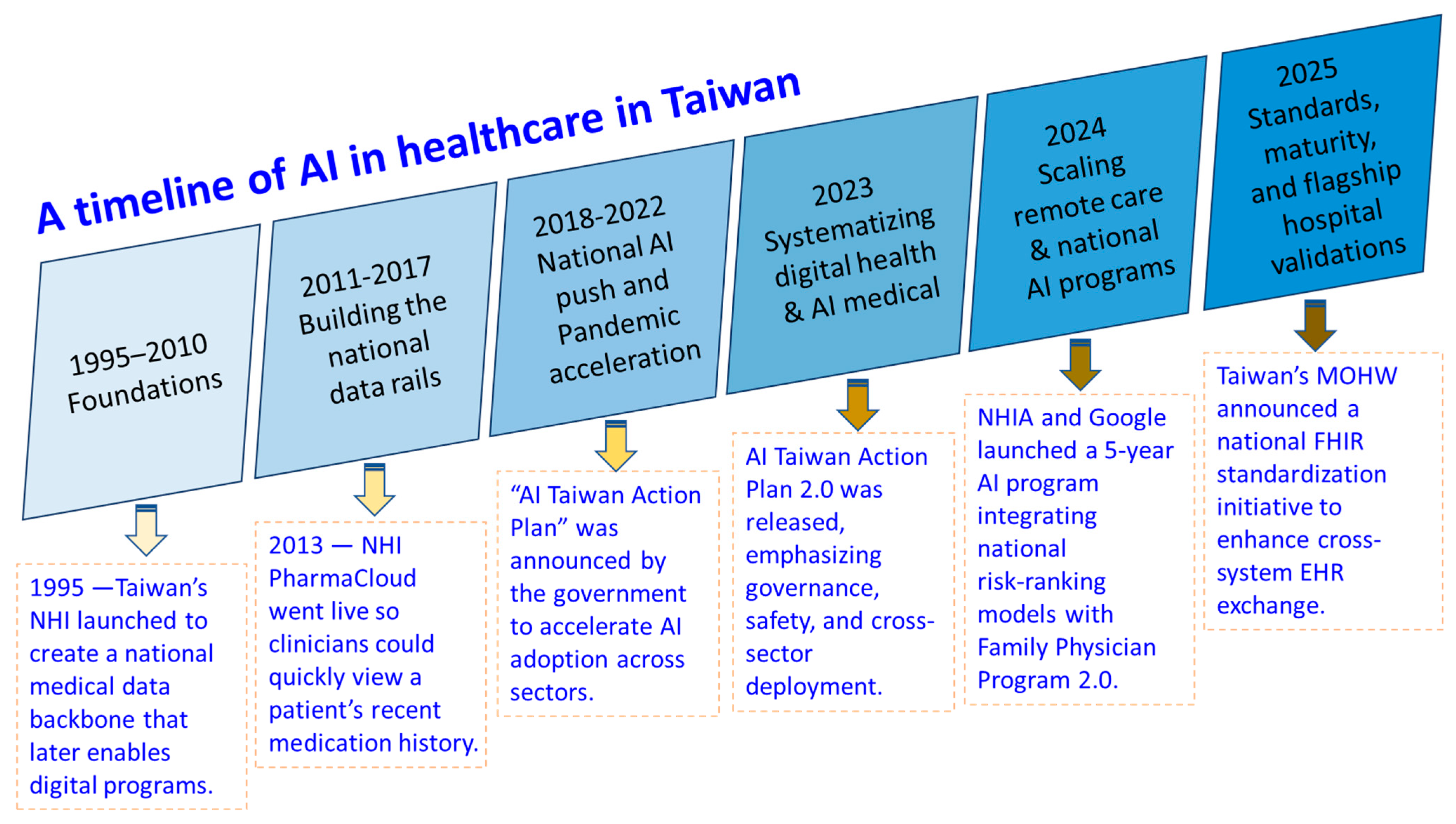 | Data Infrastructure | Foundations (1995–2010) | 1995—Taiwan’s NHI was launched to create a single-payer system and national data backbone that later enabled digital/AI programs. | [25] |