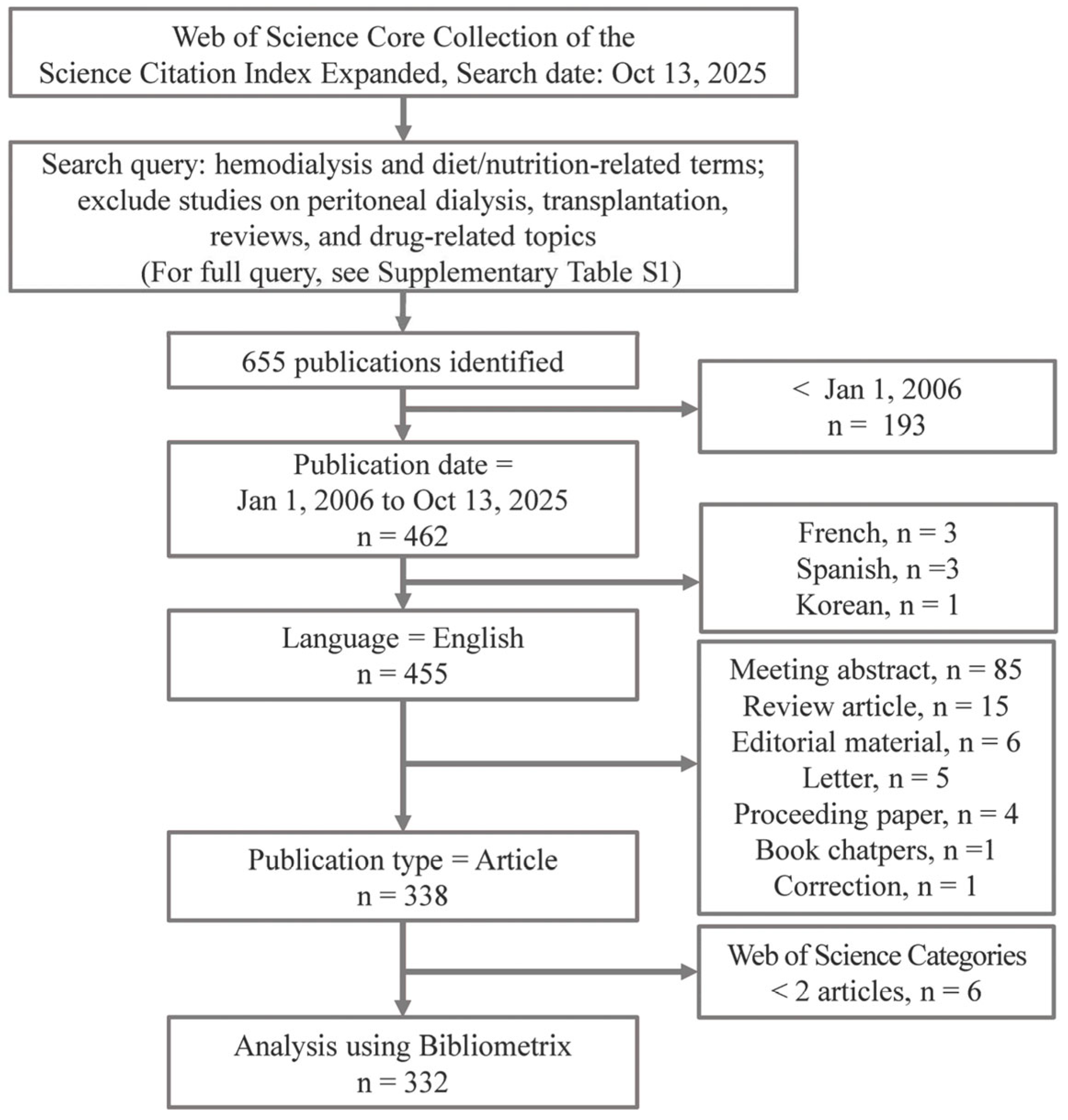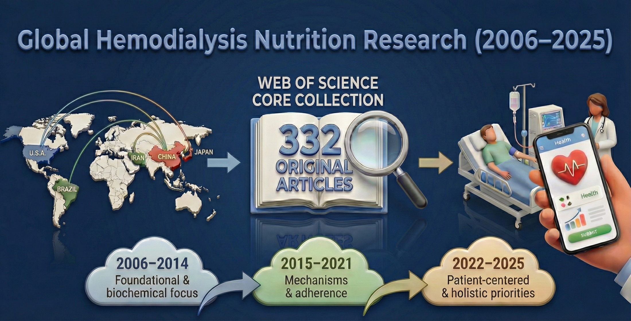 To address these gaps, we conducted a bibliometric analysis of hemodialysis-related nutrition research indexed in the Web of Science Core Collection from 2006 to 2025. This 20-year timeframe was selected to focus on contemporary trends relevant to current health system planning, distinct from historical biochemical foundational work. We sought to (1) map global publication patterns and identify leading countries, institutions, journals, and contributors; (2) examine citation impact and the characteristics of influential studies; and (3) analyze the conceptual structure and evolution of research themes. These objectives are intended to provide an updated overview of how evidence in hemodialysis nutrition has developed and to support clinicians selecting evidence-based interventions, researchers identifying areas requiring further inquiry, and policymakers planning nutrition support within dialysis services.