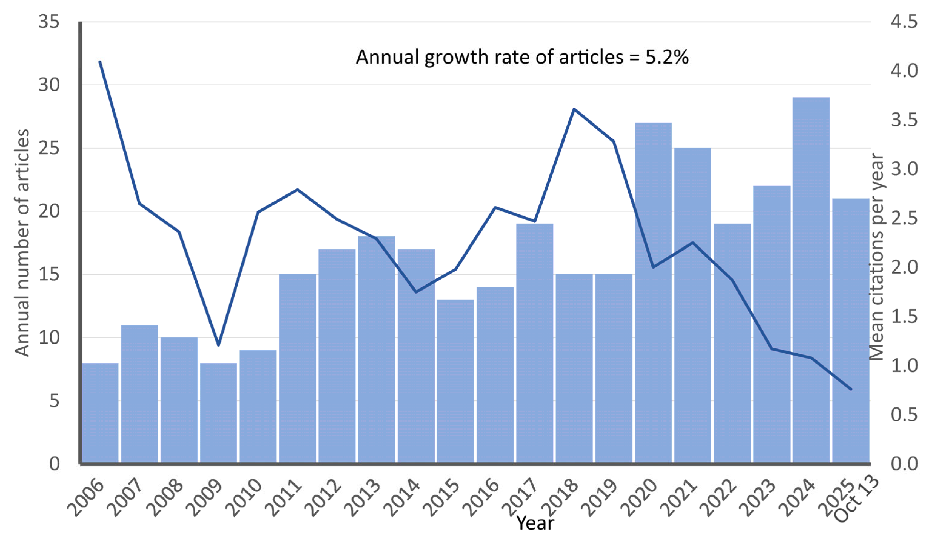 Annual output increased from 8 articles in 2006 to a peak of 29 in 2024, followed by 21 in 2025. Production was modest in 2006–2009 (8–11 papers per year), rose steadily during 2010–2014 (9–18), fluctuated in 2015–2019 (13–19, with 15 in both 2018 and 2019), and expanded from 2020 onward (27 in 2020, 25 in 2021, and 19–29 during 2022–2025). Mean citations per year were highest for the earliest cohort (4.09 in 2006), generally ranged around 2.0–2.8 during 2010–2017, reached local maxima in 2018–2019 (3.61 and 3.28), and then declined in the most recent years from 2.00 in 2020 to 0.76 in 2025. This downward trend is an expected bibliometric artifact reflecting citation accrual lag, as articles published more recently have had significantly less time to be read and cited than older works. It therefore does not indicate a decline in research impact (