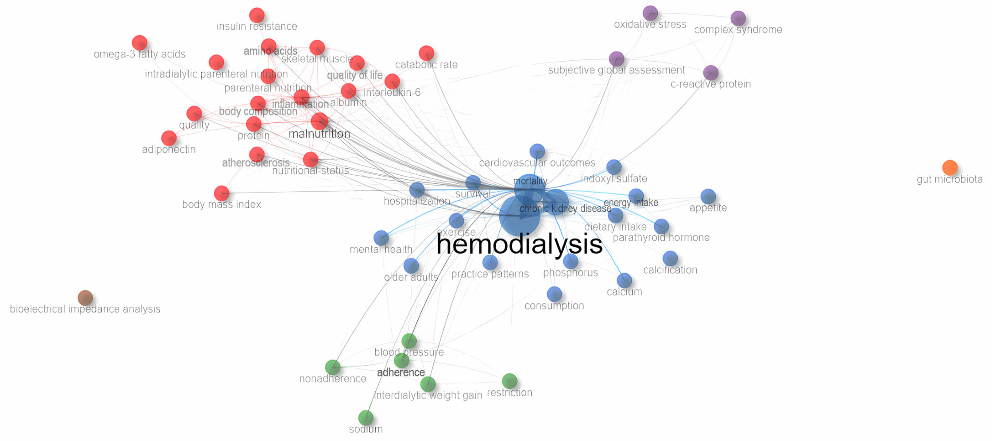 Moreover, a green cluster captures themes of treatment behavior and fluid balance, anchored by the terms “adherence”, “interdialytic weight gain”, and “blood pressure.” This represents a body of work focused on patient compliance and its direct physiological impacts. A purple cluster groups key inflammatory markers and assessment tools, including “C-reactive protein”, “oxidative stress”, and “subjective global assessment”, indicating a focus on diagnostic and prognostic screening. On the periphery of the network, terms with sparser connections suggest emerging or niche topics. Notably, “gut microbiota” appears as a nearly isolated node, signifying its novelty in the field, while “bioelectrical impedance analysis” forms a small, distinct cluster related to specific assessment techniques. Overall, the network map reveals a field organized around clinical outcomes and nutrient management, with strong sub-specialties in malnutrition, inflammation, and patient adherence.