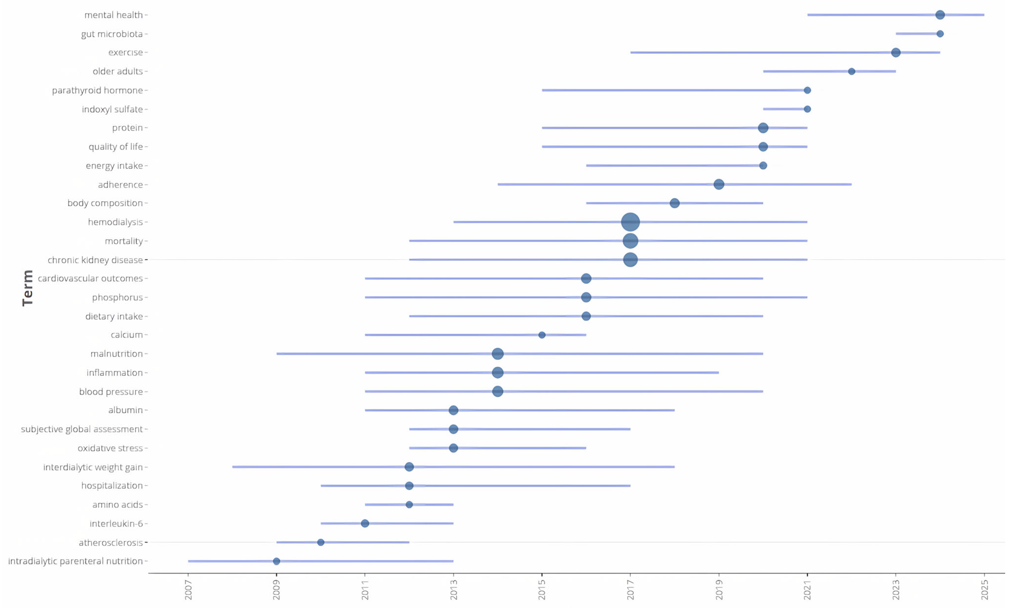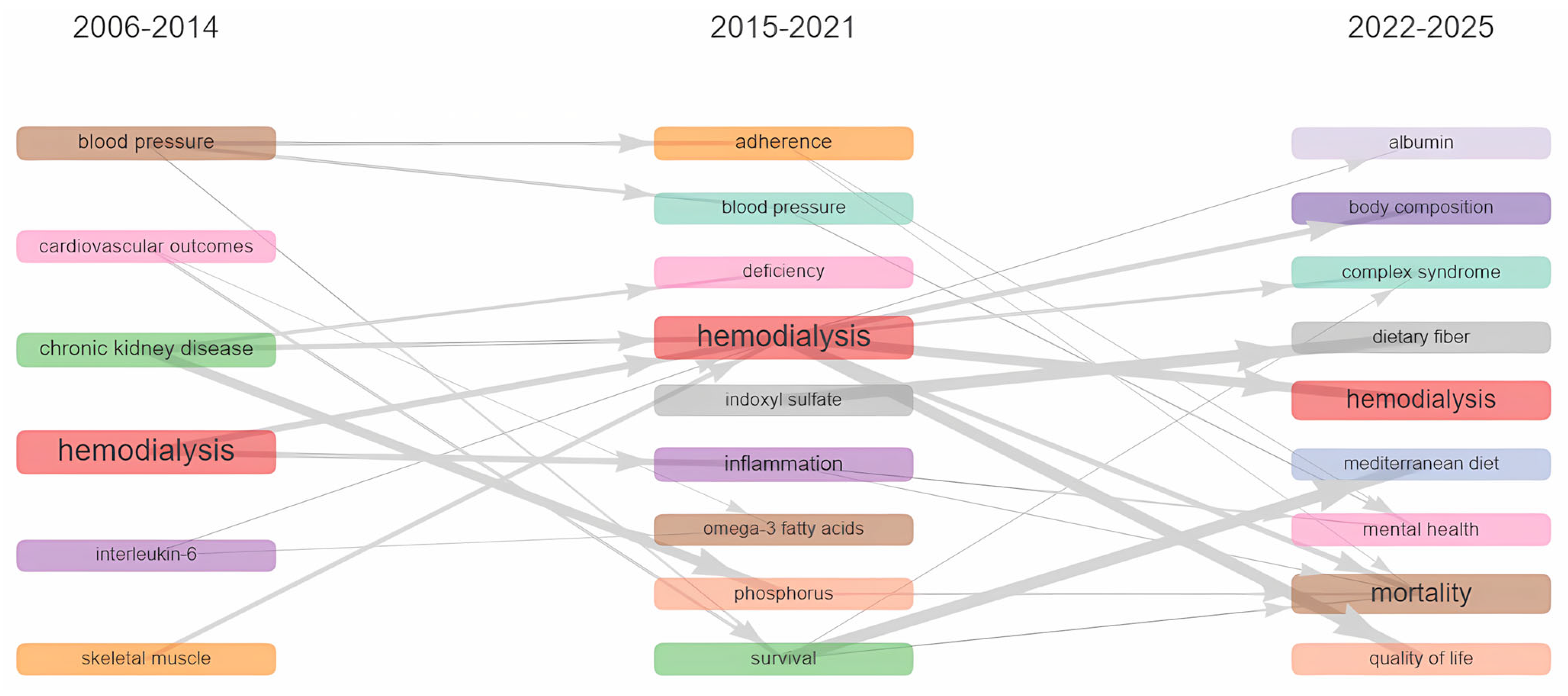 The temporal evolution of research themes demonstrates a progression from biochemical and pathophysiological foundations to patient-centered perspectives. Early work (2006–2014) focused on core clinical parameters, such as cardiovascular outcomes, blood pressure, and mineral bone metabolism, reflecting efforts to characterize mortality risks and treatment complications. Between 2015 and 2021, these broad domains evolved into more specific and mechanistic themes, including inflammation, phosphorus metabolism, adherence, and uremic toxins, indicating a shift toward understanding modifiable pathways linking nutrition to outcomes. In the most recent period (2022–2025), the field has moved toward integrative themes such as “complex syndrome”, “quality of life”, and “mental health.” This conceptual shift signals a growing recognition of the multidimensional burden of hemodialysis and a more holistic view of nutritional health. As a result, increasing attention is being given to diet quality, psychosocial factors, and patient-reported outcomes. This shift is evidenced by the displacement of “mortality” and “calcium” as dominant nodes by “quality of life” and “mental health” in the most recent time quadrant (2022–2025). In the context of hemodialysis, this represents a transition to patient-centered priorities, where the goal of nutrition support extends beyond correcting biochemical derangements to preserving physical function and minimizing the burden of dietary restrictions. Future research should prioritize integrating patient-centered elements. This bibliometric trend aligns with the recent Kidney Disease: Improving Global Outcomes (KDIGO) 2024 [