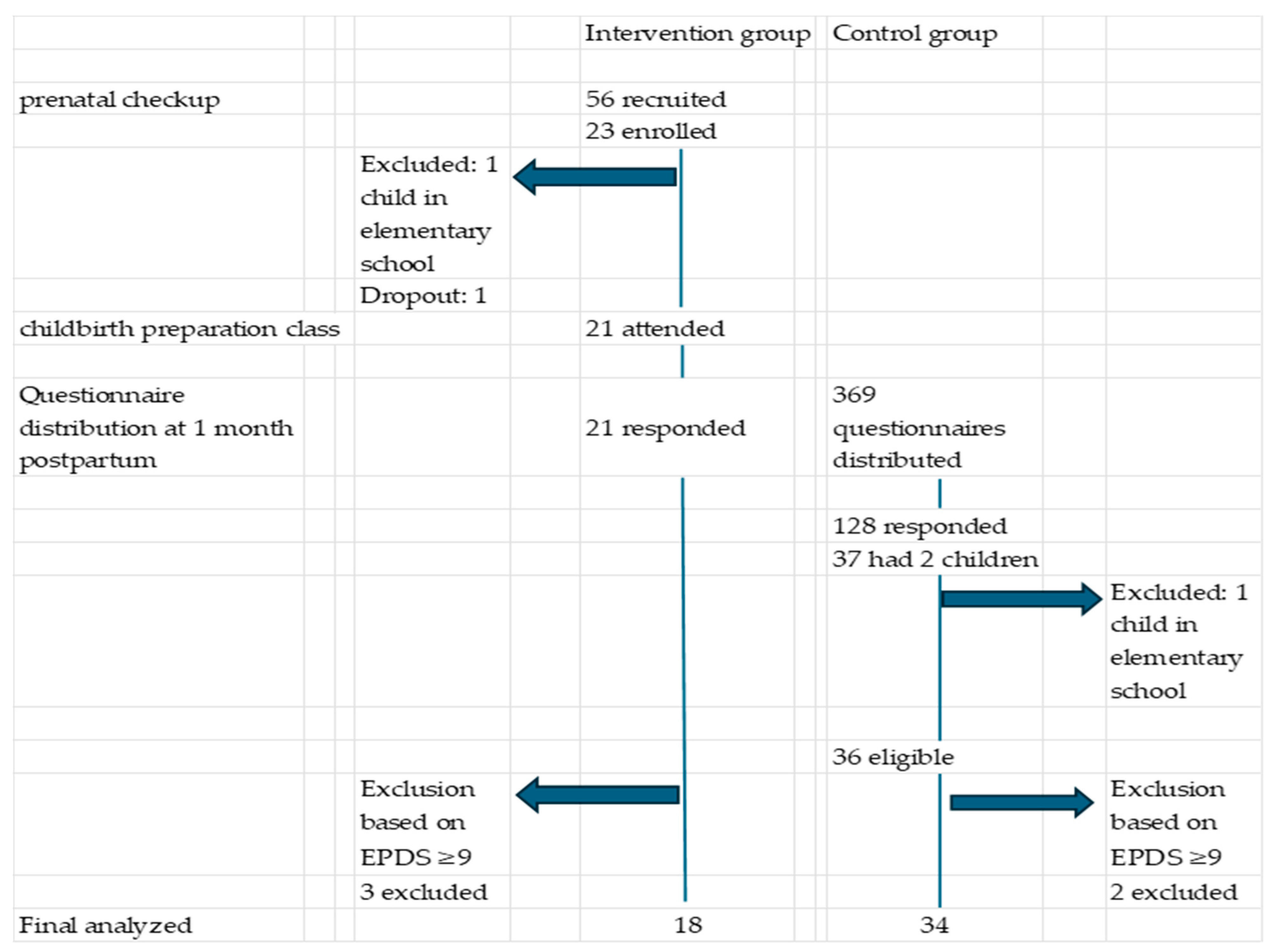 34]. Participants in both groups with EPDS scores ≥ 9 were excluded from the analysis. The final sample included 18 and 34 mothers in the intervention and control groups, respectively.