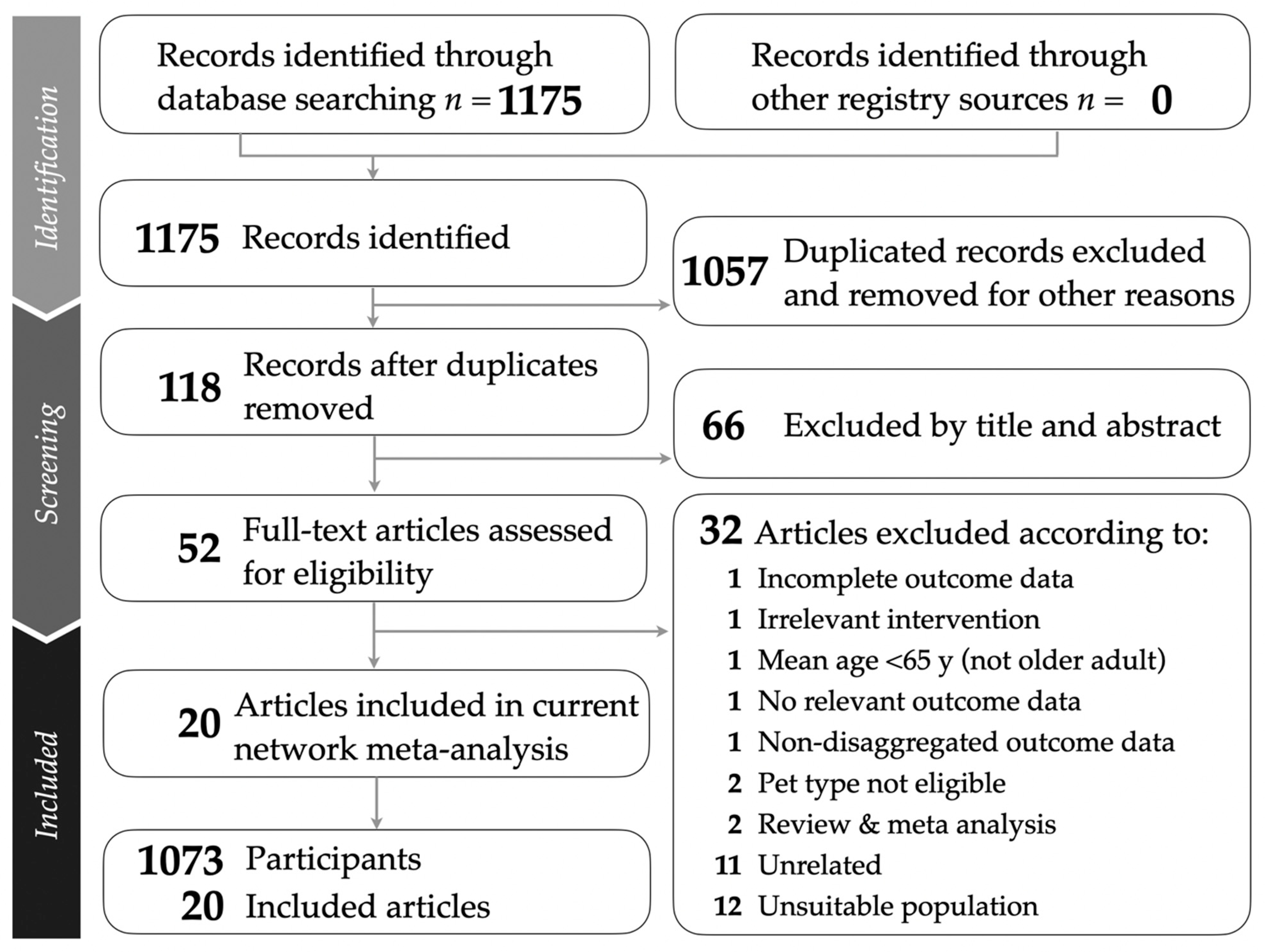 APA StyleDai, M.-L., Ting, B., Tseng, R. J.-H., Huang, Y.-L., Lin, C.-C., Chen, M.-H., Lin, P.-Y., & Liu, T.-Y. (2026). From Dogs to Robots: Pet-Assisted Interventions for Depression in Older Adults—A Network Meta-Analysis of Randomized Controlled Trials. Healthcare, 14(1), 38. https://doi.org/10.3390/healthcare14010038