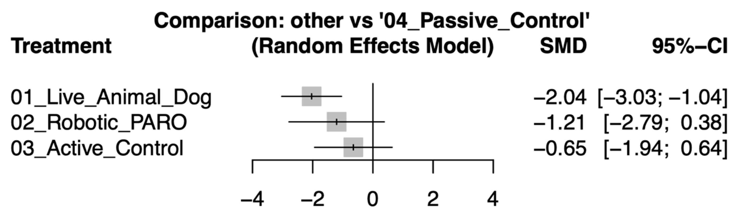| −2.04 [−3.03; −1.04] | −1.21 [−2.79; 0.38] | −0.65 [−1.94; 0.64] | Passive Control |
