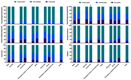 Percentage of workers in favorable, intermediate, and unfavorable exposure categories for each COPSOQ-ISTAS21 dimension. Bars represent the percentage of participants whose raw scores fall into the favorable, intermediate, or unfavorable bands defined by the Spanish ISTAS21 reference cut-offs for each dimension. * p ≤ 0.05.