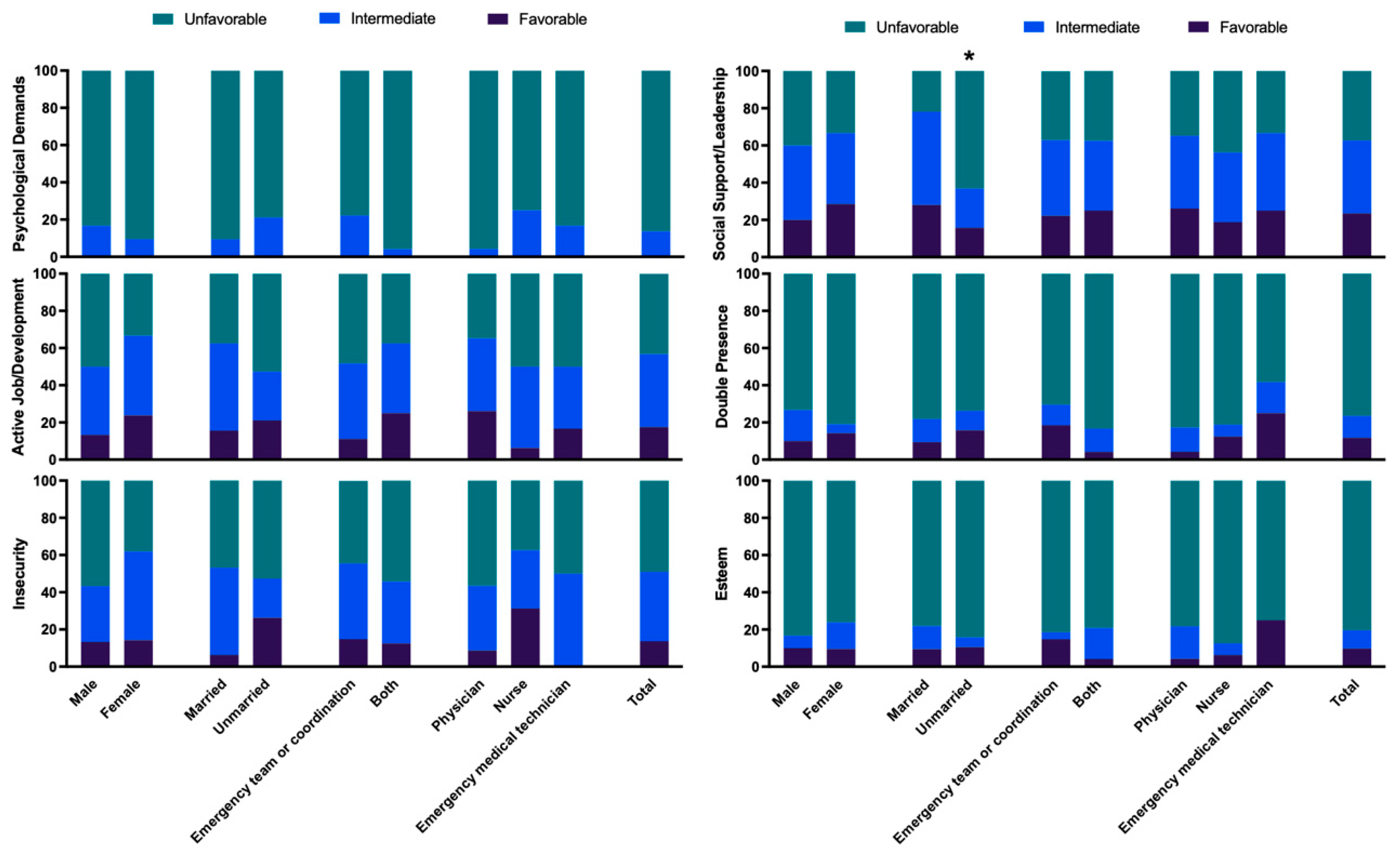 | Social Support Leadership | 24.53 (6.3) | 23.77 (6.61) | 25.62 (5.82) | 0.306 | 26.25 (4.64) | 21.63 (7.7) | 0.025 * | 24.22 (7.05) | 24.88 (5.47) | 0.716 | 25.26 (5.25) | 22.19 (7.96) | 26.25 (5.19) | 0.183 |