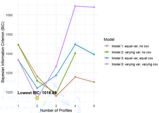 Model BIC by number of profiles. Note. The figure illustrates the behavior of the Bayesian Information Criterion (BIC) for models with an increasing number of latent profiles (ranging from 1 to 5), comparing four model specifications: Model 1 (equal variances, no covariance), Model 2 (unequal variances, no covariance), Model 3 (equal variances, equal covariances), and Model 5 (free variances and covariances). The yellow dot highlights the lowest BIC value.