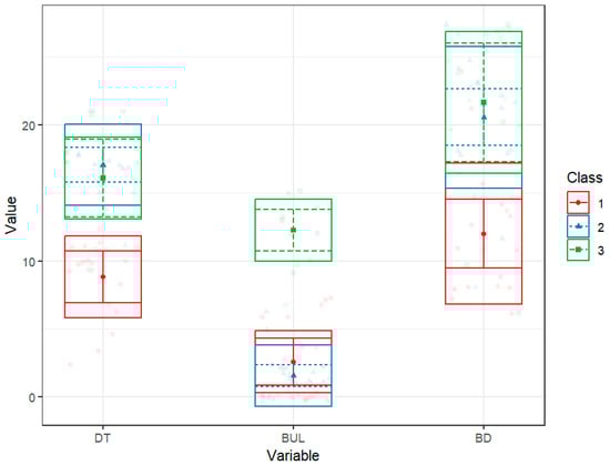 Distribution of psychopathological scores in the three latent profiles. Note. The figure illustrates the distribution differences in individual scores between the latent profiles in Drive for Thinness (DT), Bulimia (BUL), and Body Dissatisfaction (BD) scores within the three identified classes: Class 1 (red), Class 2 (blue), and Class 3 (green). The graph displays the estimated means of the scores for each profile (squares in the center of the box), along with 95% confidence intervals (vertical lines extending from the center square) and standard deviations above and below the mean (horizontal lines above and below the center square). The colored dots represent the individual observed data for each class.