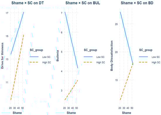 Moderation analysis. Note. The figure illustrates the interactions between shame-proneness and self-compassion (SC) in predicting Drive for Thinness (DT), Bulimia (BUL), and Body Dissatisfaction (BD). The graphs display the regression lines, categorized by SC level (low = solid blue; high = dashed orange). For BD, the interaction is significant: at low levels of shame, high SC is associated with markedly lower BD than low SC, but this difference decreases as shame increases, with the two lines converging at higher levels of shame. This pattern suggests that SC attenuates the impact of shame on BD when shame is relatively low to moderate, but this buffering effect weakens at high levels of shame. For DT and BUL, the interactions are not significant.