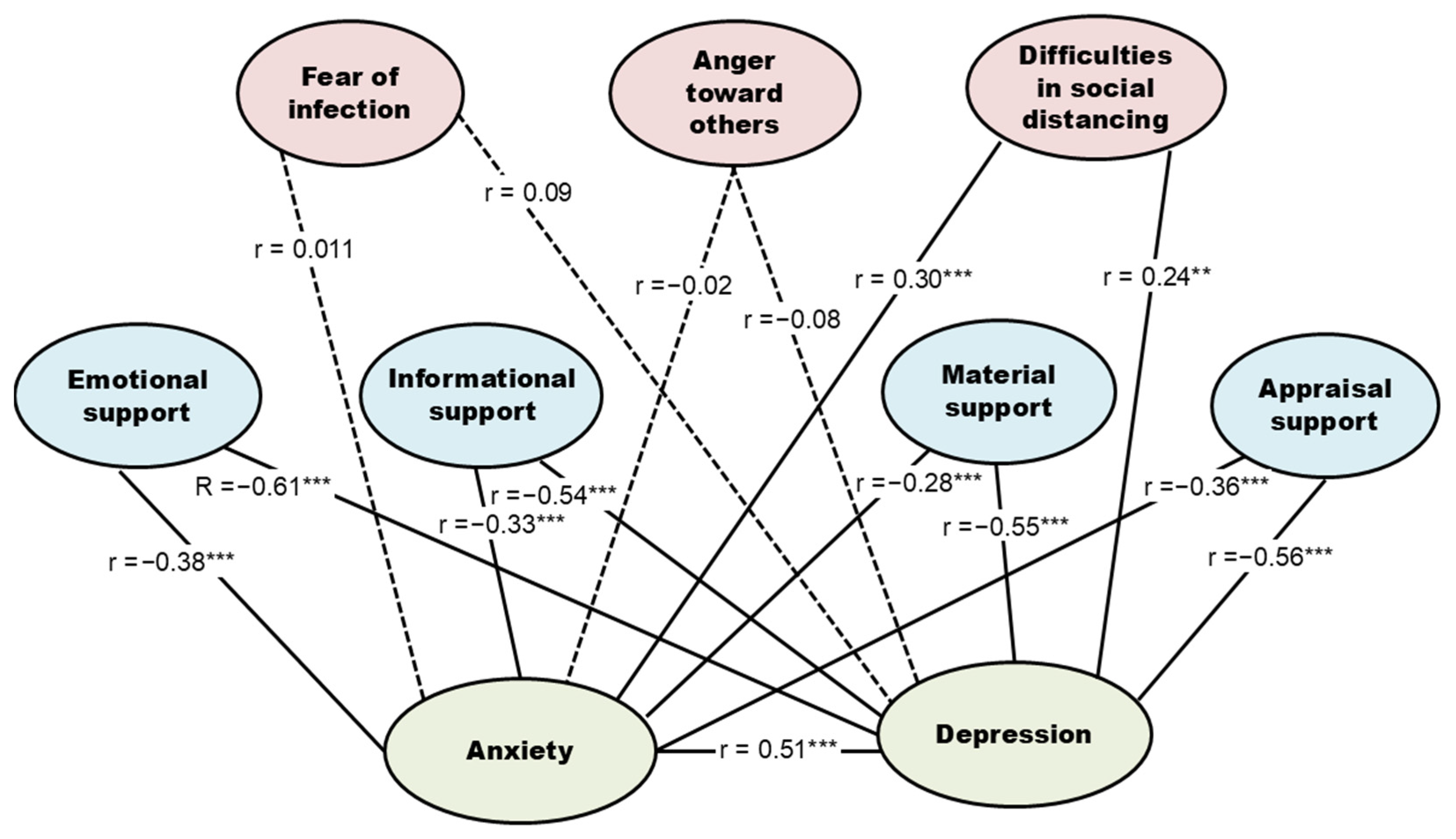 3.3. Correlations Among Anxiety, Depression, Infectious Disease-Related Stress, and Social Support