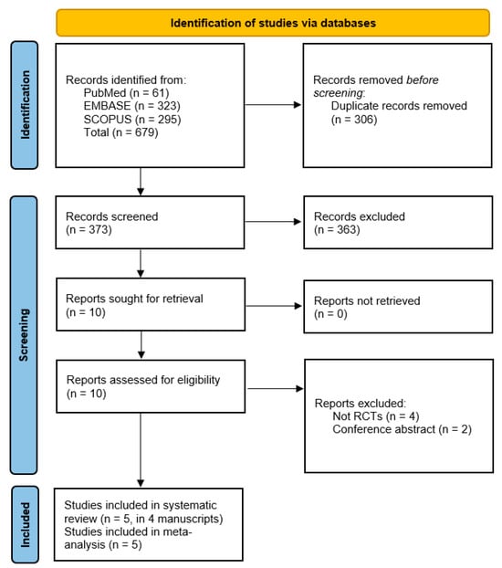 Out of 679 records identified from PubMed, EMBASE, and Scopus, 306 duplicates were removed. After screening 373 records, 363 were excluded. Of the 10 reports assessed for eligibility, 6 were excluded because they were not RCTs or conference abstracts. Finally, 5 studies (in 4 manuscripts) were included in both the systematic review and meta-analysis [8,9,15,16], Figure 1.
