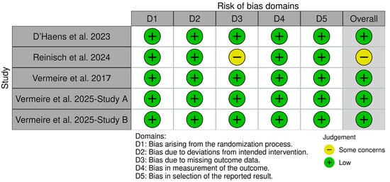 Using the ROB 2 tool, the quality assessment of the included studies revealed low risk of bias in most domains. Vermeire et al. (2017), Vermeire et al. (2025) (study A and Study B), and D’Haens et al. (2023) were rated as low risk across all five domains, indicating high methodological quality [8,9,16]. Reinisch et al. (2024) showed “some concerns” in missing outcomes data and the overall risk of bias, despite being rated low in the other domains [15], Figure 2.