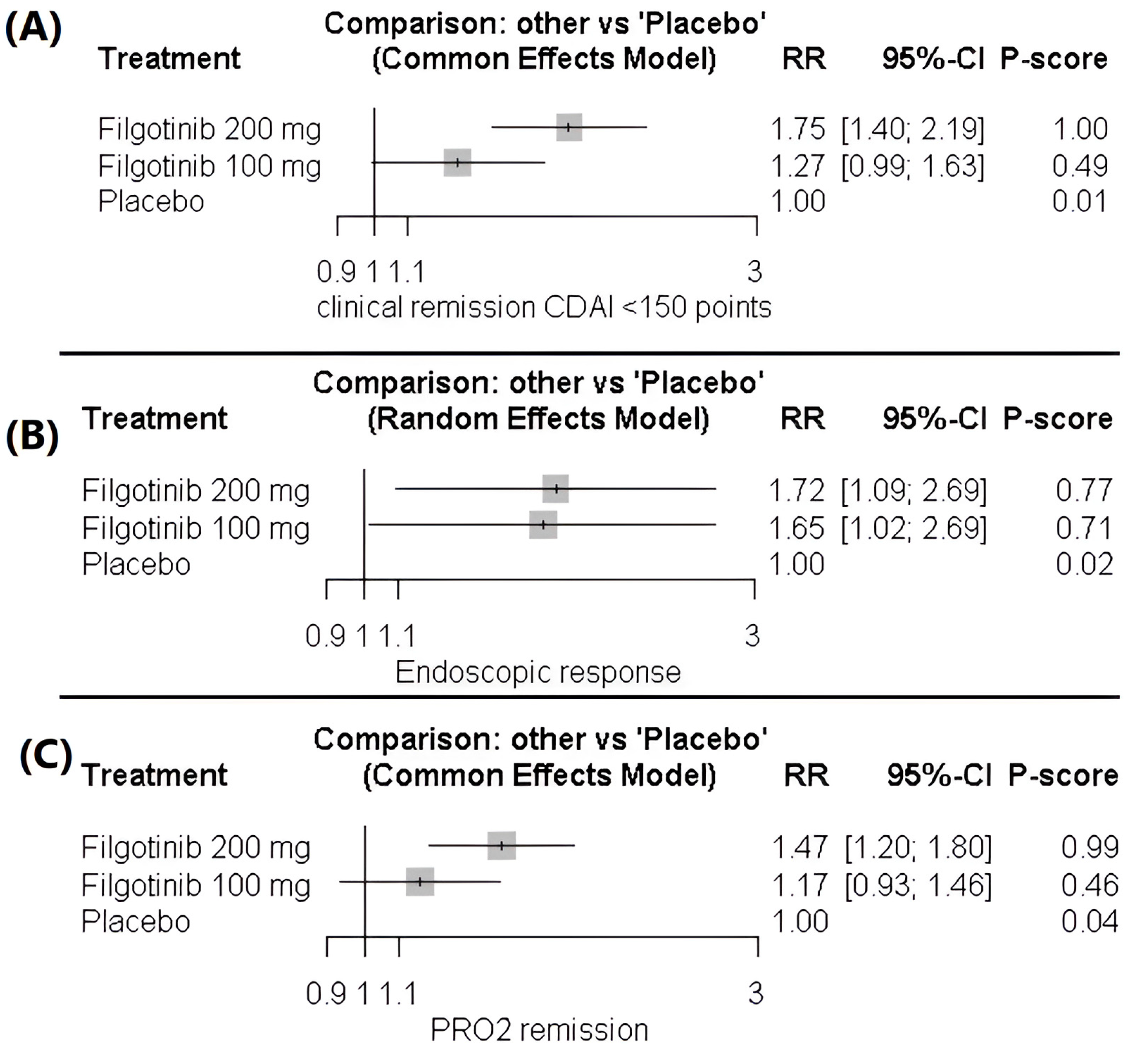 APA StyleKhoshaim, Y. A., Habis, Y. Z., Daqnah, A. G., Alqurashi, R. K., Abdulrahim, Y. S., Sakkat, A., Alsubhi, S. A., Almuwlad, D. T., Bukhari, H. S., Shogdar, A. J., Amir, O. A., & Zaazouee, M. S. (2026). Filgotinib in Moderate-to-Severe Crohn’s Disease: A Network Meta-Analysis of Efficacy and Adverse Events. Healthcare, 14(1), 5. https://doi.org/10.3390/healthcare14010005