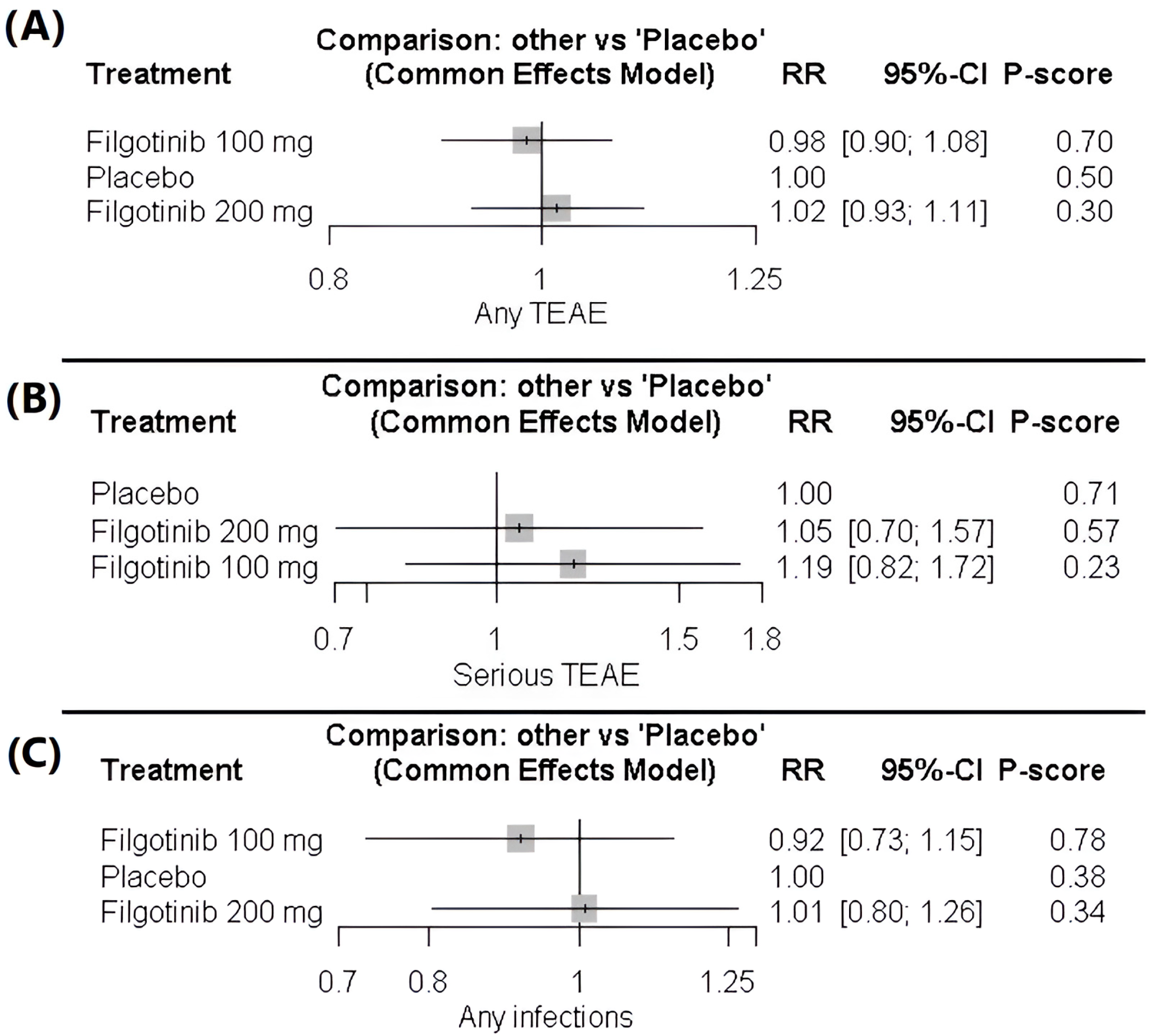 | Infection Risk | 4 RCTs | RCTs | Low | None | None | None | 0.36 | High | No increased infection risk with filgotinib vs. placebo |