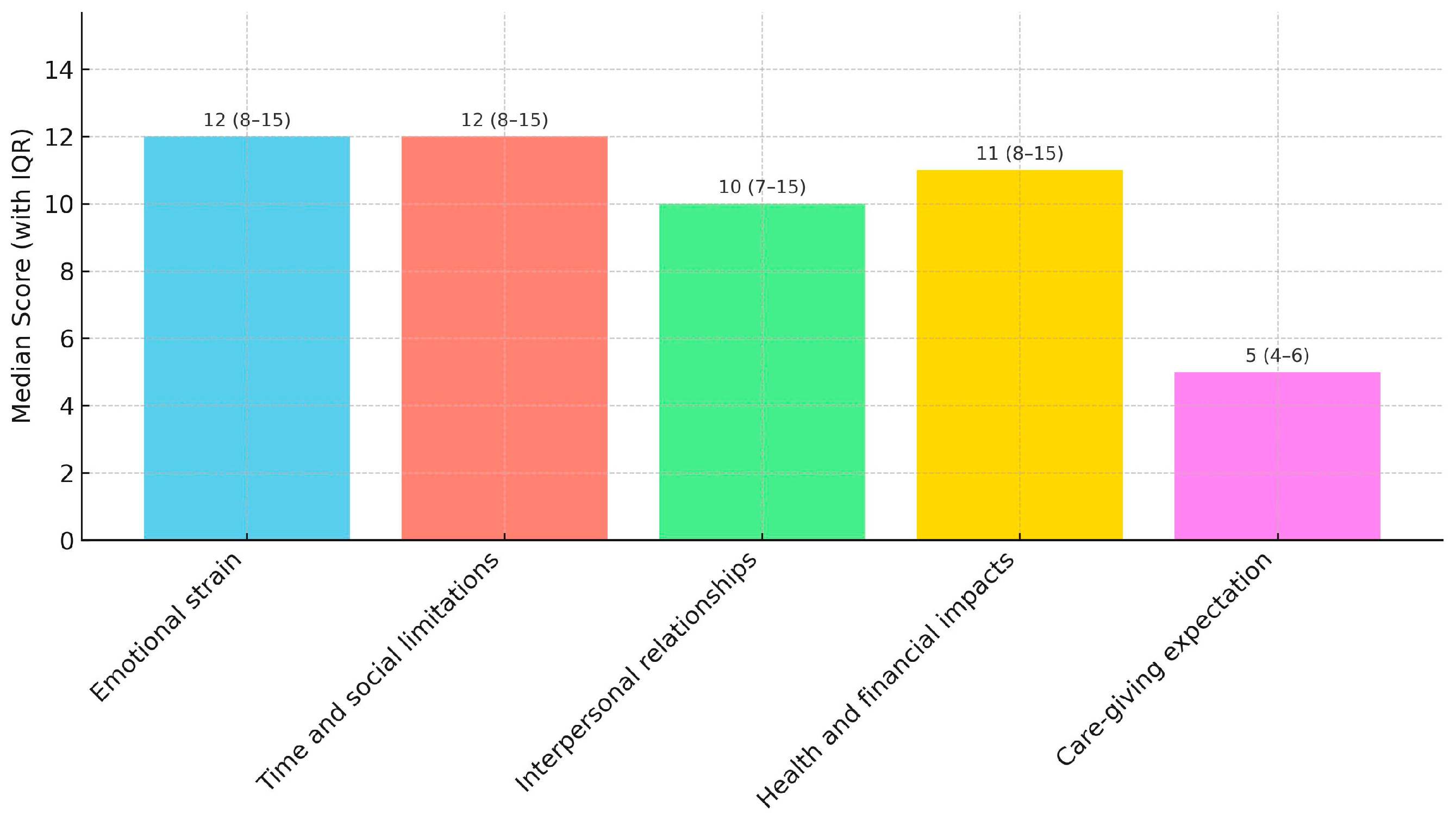 | Variables | Frequency | Emotional Strain | Time and Social Limitations | Interpersonal Relationships and Dependency | Health and Financial Impacts | Care Giving Expectation | |||||