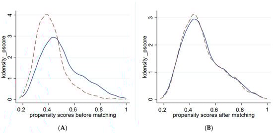 To mitigate the aforementioned “selection bias” arising from the non-random implementation of the policy, this study employs the Propensity Score Matching (PSM) method. The core rationale of PSM is to identify one or more counterfactual counterparts in the non-participating group for each child in the treatment group who are highly similar across all observable characteristics, thereby mitigating bias through these counterfactual comparisons. This study incorporates key determinants of policy adoption, including city-level medical resource supply (number of beds per capita) and household-level socioeconomic status (household per capita income, mother employment status, etc.). These variables encompass the primary dimensions influencing local government policy decision-making and household demand for medical care. We maintain that after controlling for these key covariates and passing the PSM balance test, systematic differences between the treatment and control groups can be substantially and effectively balanced, thereby mitigating “selection bias”.