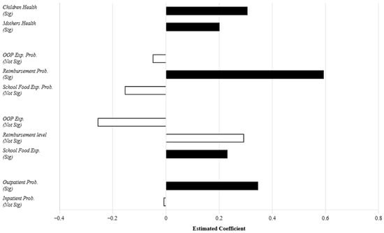 First, regarding out-of-pocket (OOP) expenditure, both the first (−0.050) and second stage (−0.257) coefficients are insignificant (Table 3, Columns 1–2). This indicates that the policy is not significantly associated with the probability or amount of OOP expenditure for rural children.