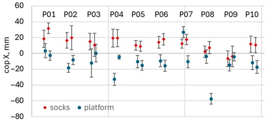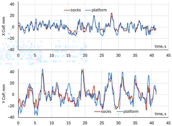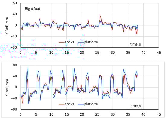 In the anteroposterior (Y) direction, visual comparison of CoP trajectories shows that, for right-leg–dominant participants, the left foot trajectories were more compactly clustered around the center, with fluctuations below ±40 mm along the Y-axis, and similar waveform patterns were observed for both measurement systems. For the right foot, the CoP spread was slightly more elongated in the anteroposterior direction (up to and over ±40 mm), while the overall directional pattern of CoP movement was similar for both measurement systems. The platform data exhibited slightly higher amplitude variation compared to the Smart Socks. Despite these minor differences, the spatial distribution and trajectory patterns remained consistent across both feet.