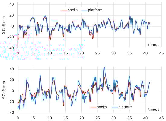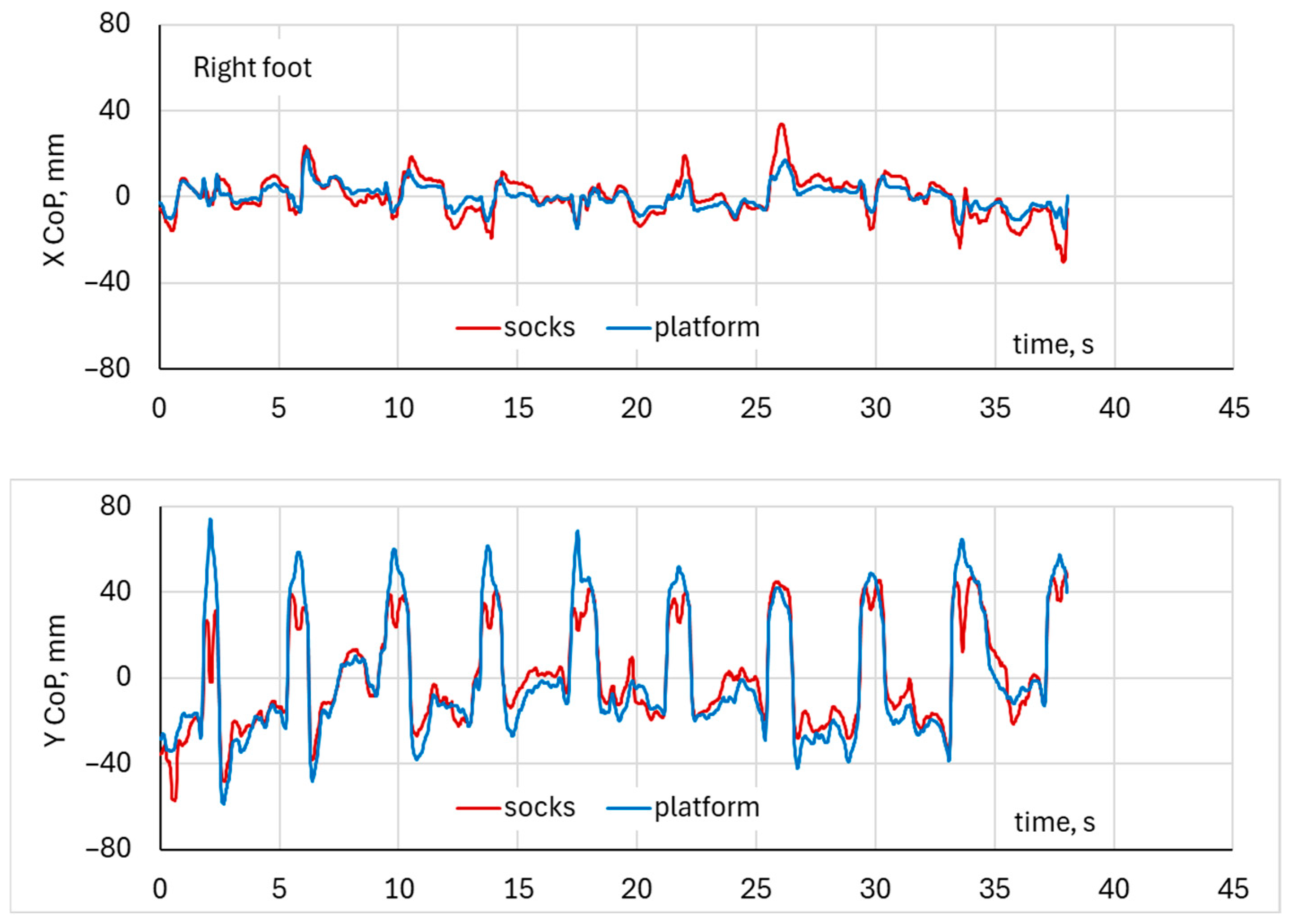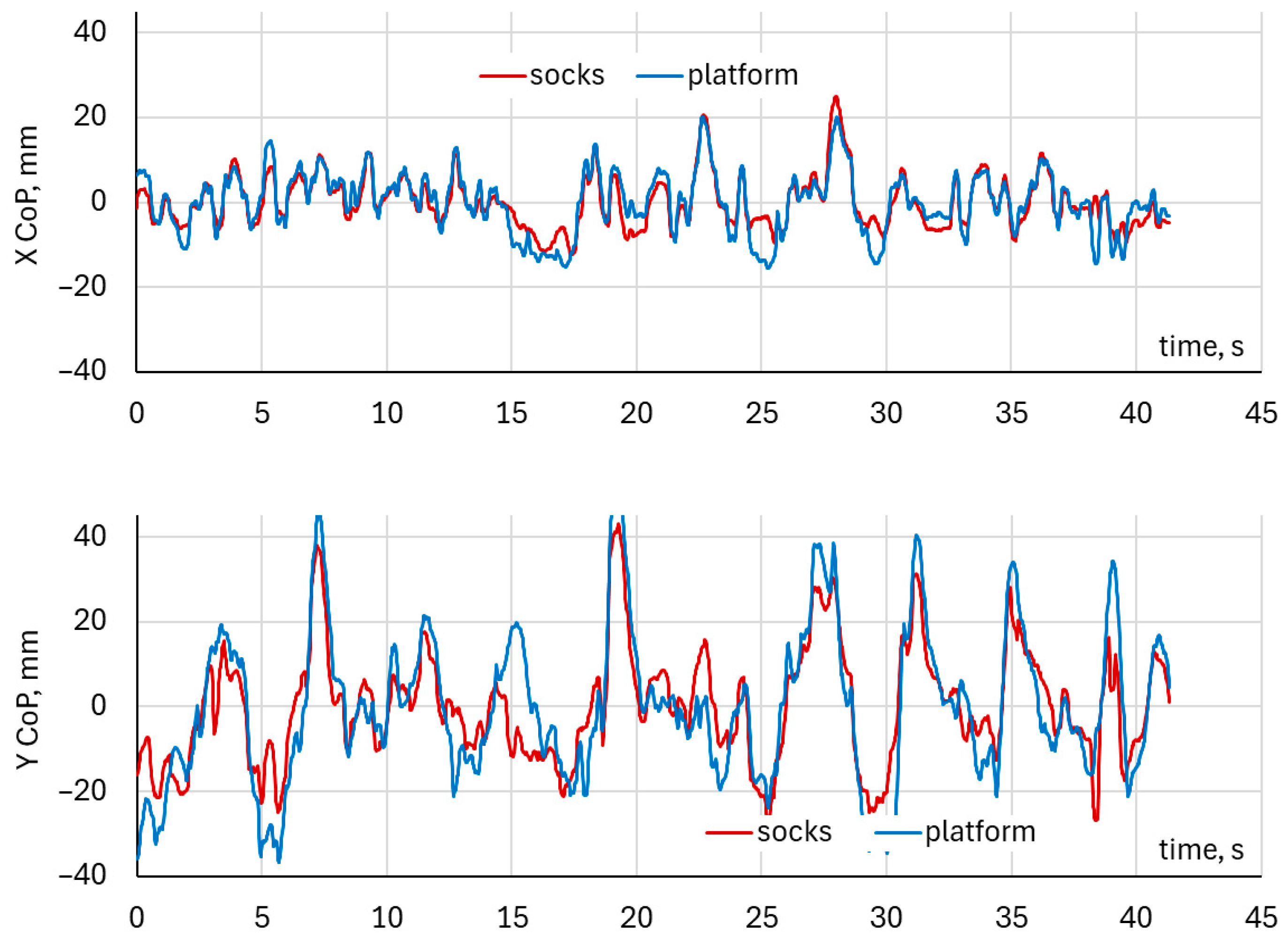 Despite the overall high agreement between the smart socks and force platform, indicating stable balance control and close correspondence between the two systems, minor discrepancies were observed, likely attributable to sensor noise, fabric deformation, or inconsistent skin–sensor contact. Similar technical limitations have been described in prior studies using textile-based sensors [