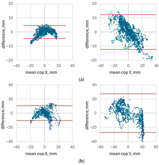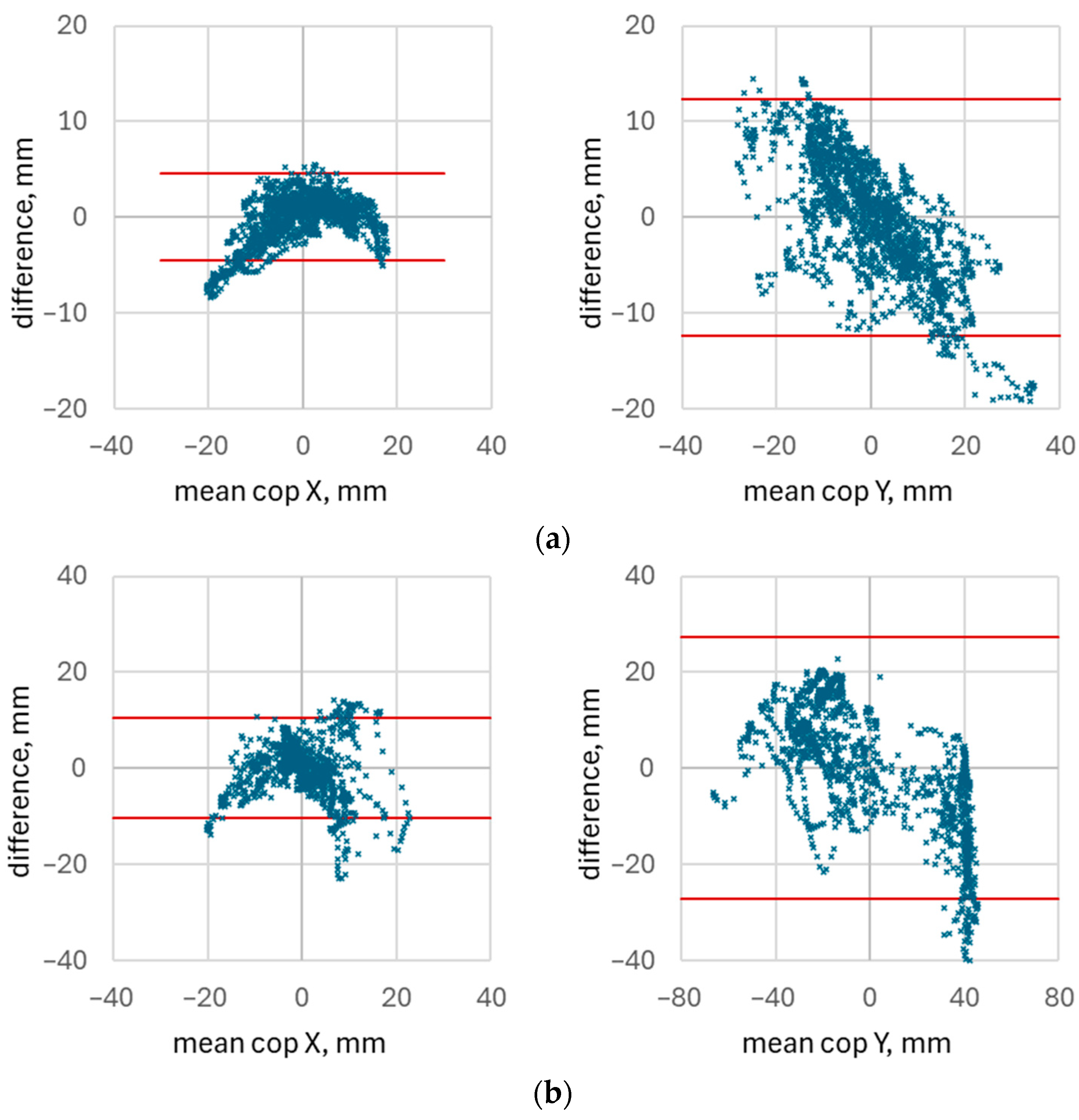 Despite the relatively small number of out-of-range points, the width of the limits of agreement is substantial when compared with the overall amplitude of the CoP signals. In the studied dataset, the span between the upper and lower limits typically reached approximately 25% of the total range of CoP variation during the exercises. This large spread demonstrates considerable disagreement between the values obtained from the socks and those obtained from the force platform.