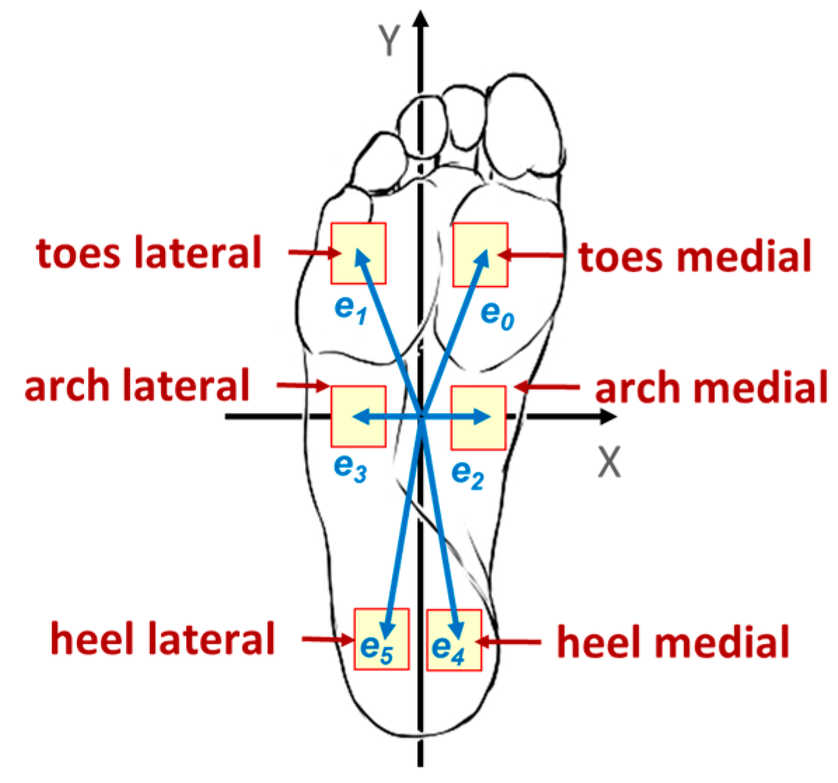 The positions of the six sensors were defined in a local coordinate system fixed to the sock sole. Vectors were assigned relative coordinates (mm) that represent the spatial distribution of sensors rather than their absolute locations on the anatomical foot. The relative positions were: e0 = (50, 100), e1 = (−50, 100), e2 = (50, 0), e3 = (−50, 0), e4 = (25, −100), e5 = (−25, −100), where the X-axis indicates the medial-lateral direction and the Y-axis indicates the anterior–posterior direction (