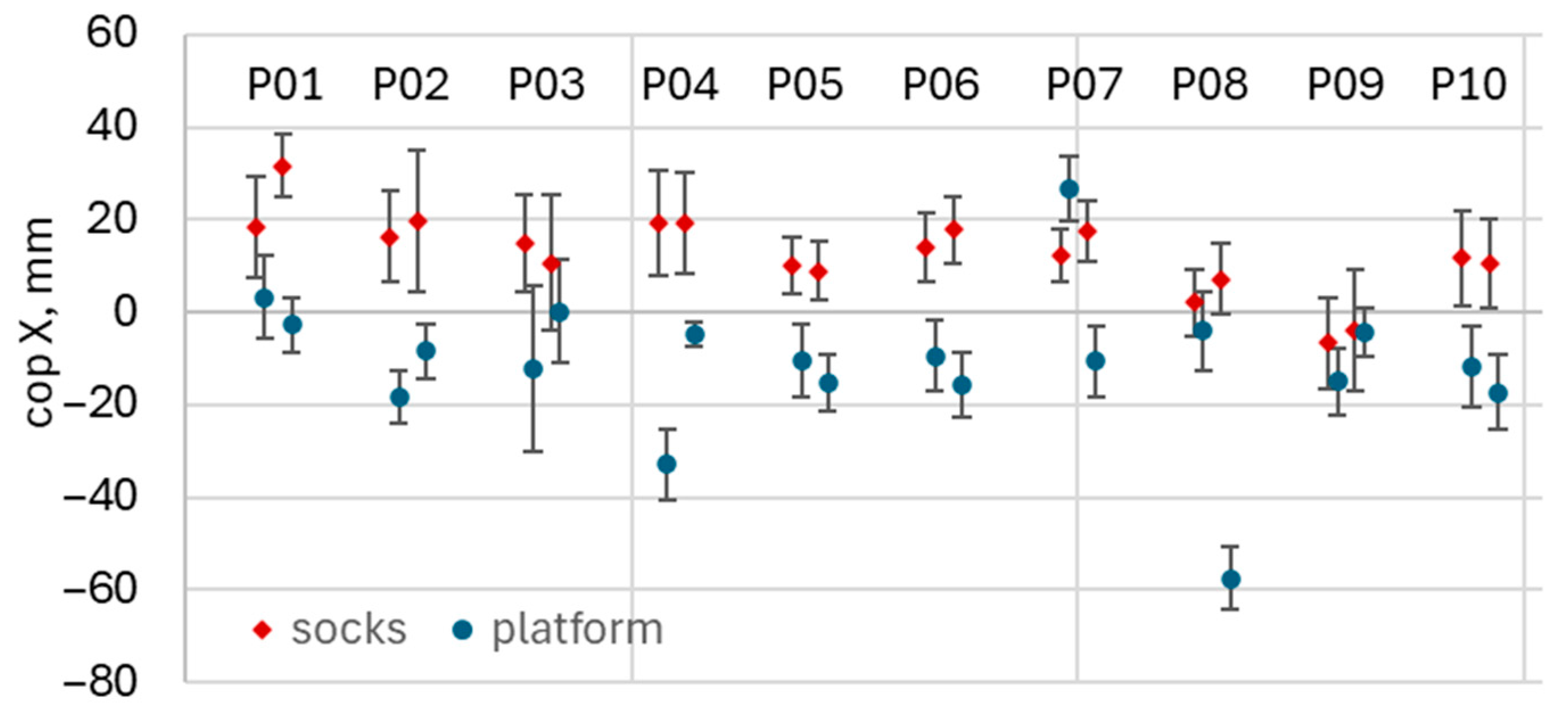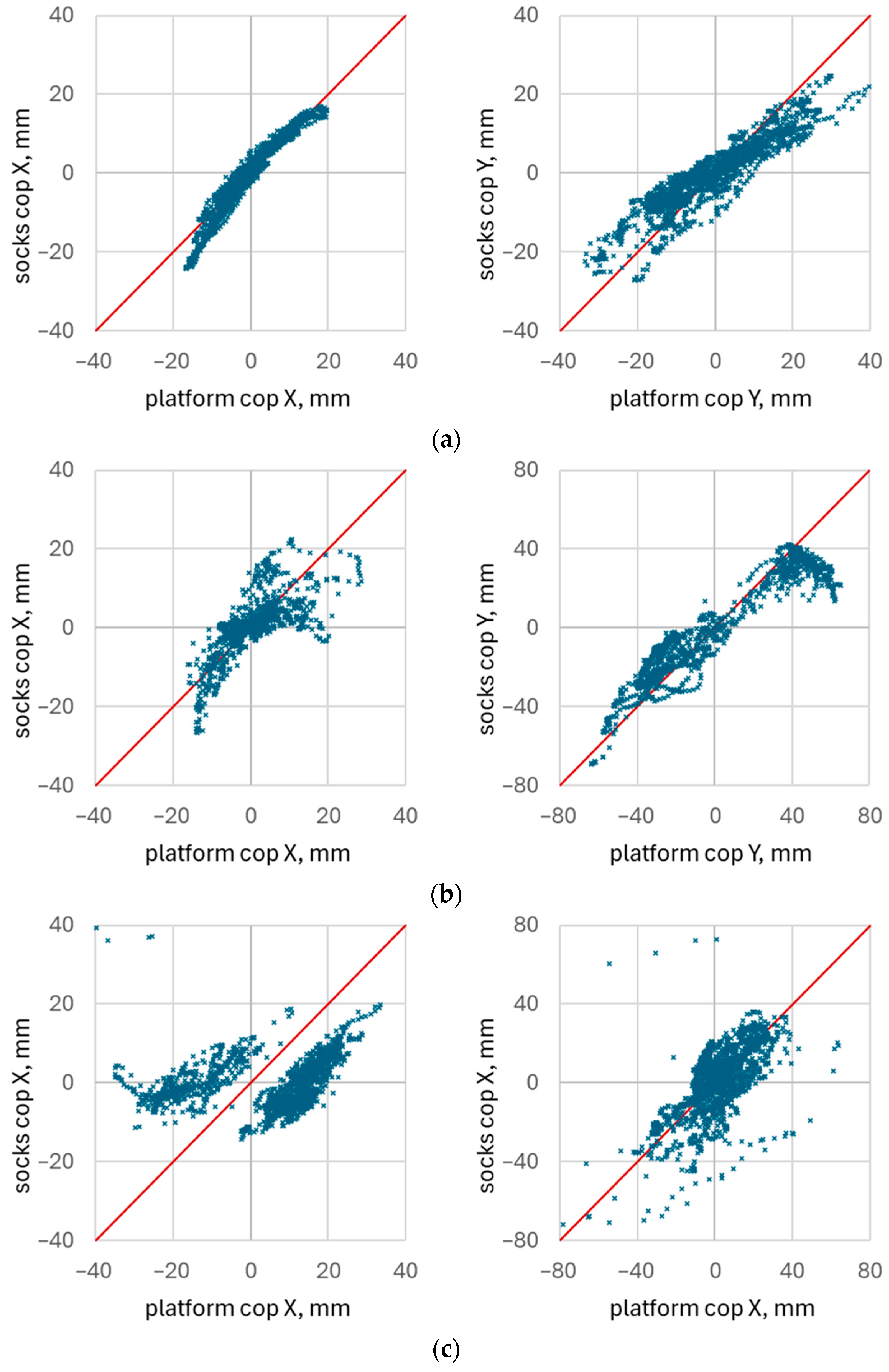 The constructed scatter diagrams (“CoP by socks vs. CoP by platform”) allowed for a visual assessment of the relationship between the two measurement modalities.