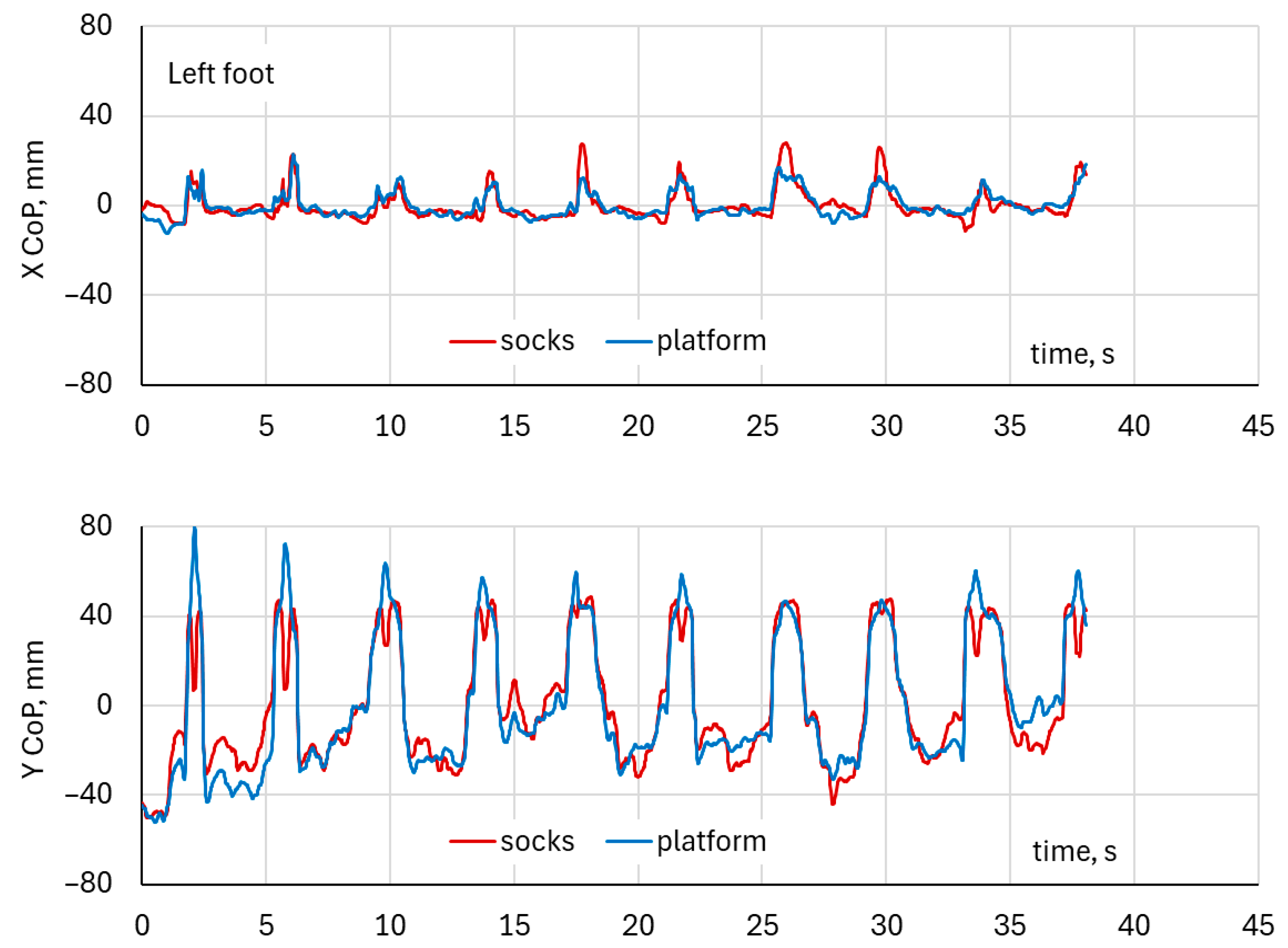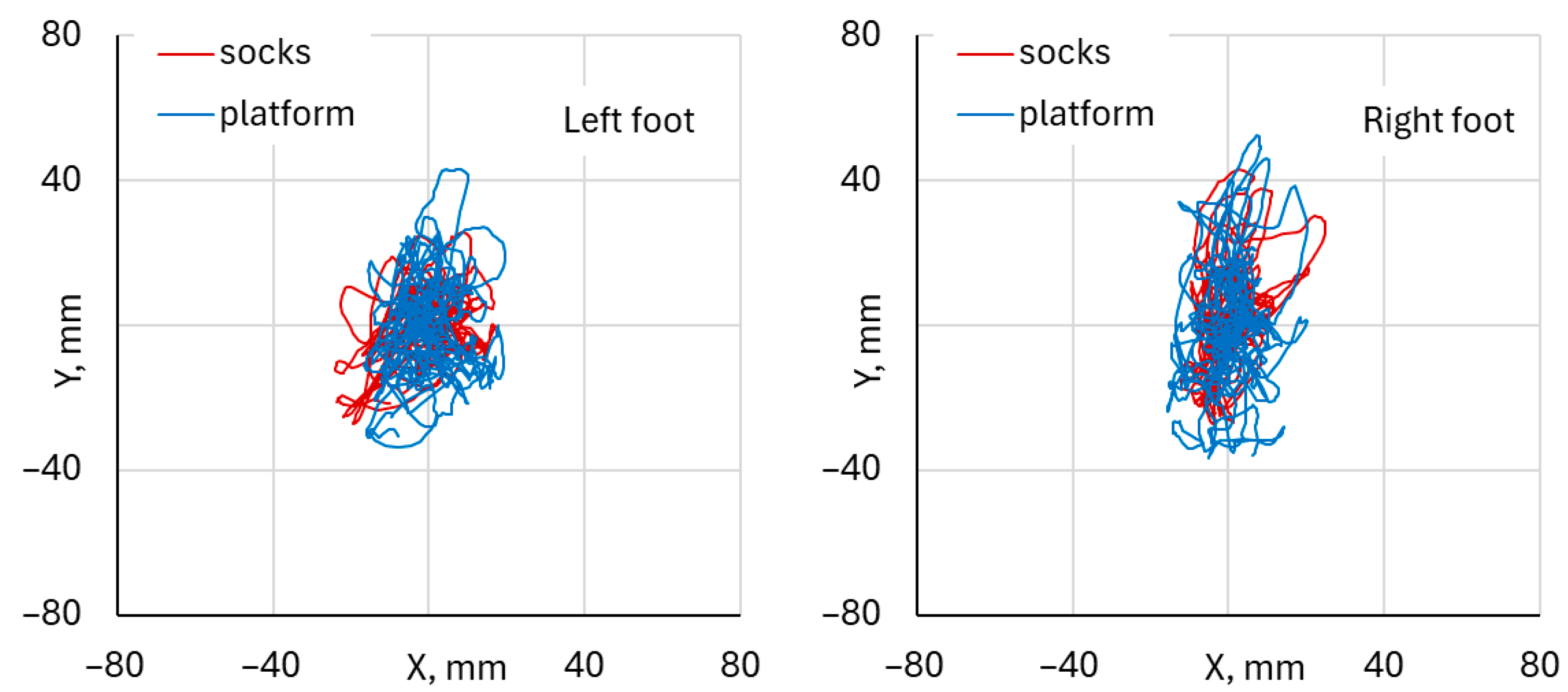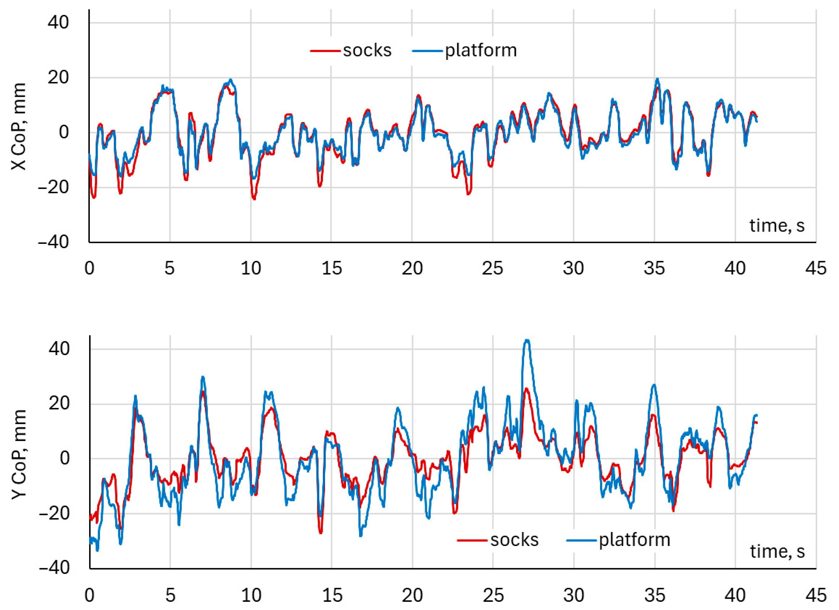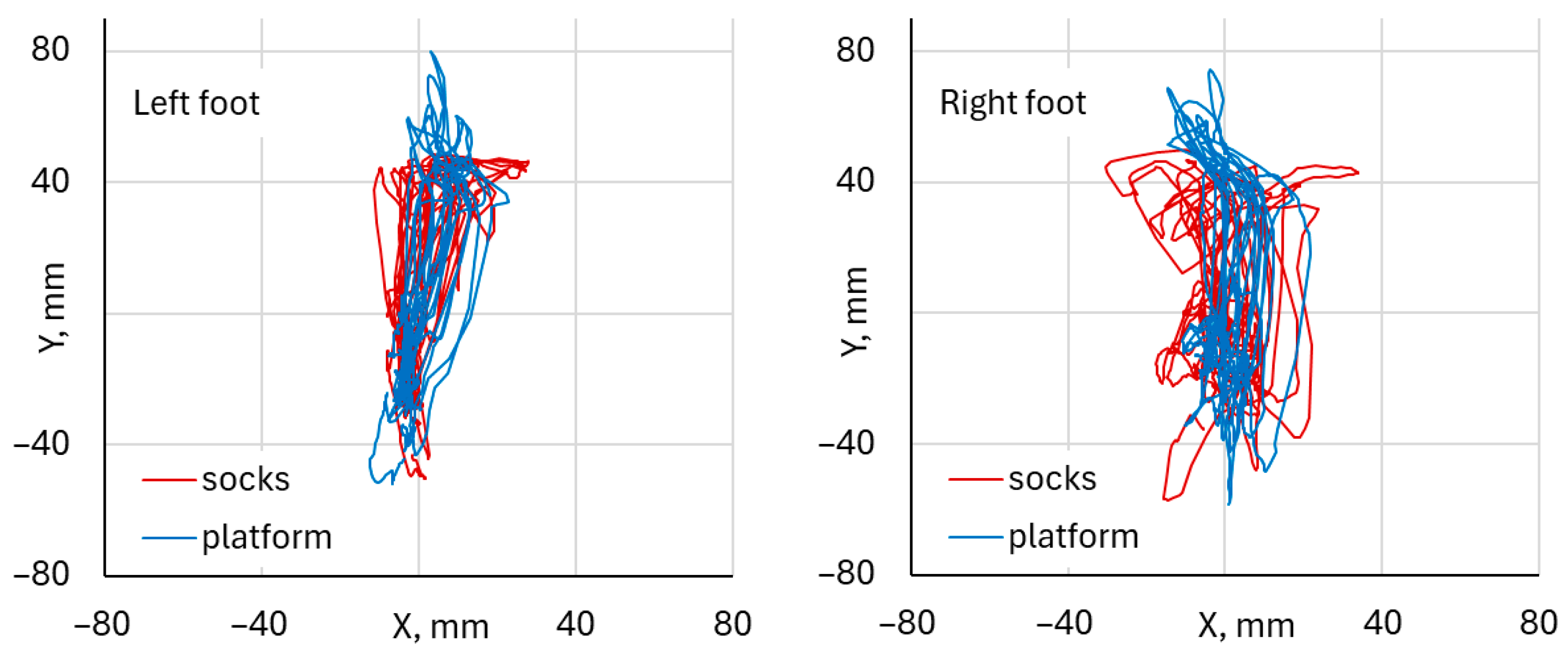 ® Smart Socks closely reproduced the trajectory shape and direction measured by the force platform, showing consistent path overlap and similar amplitude ranges. Although the platform data exhibited slightly greater dispersion, particularly in the superior and inferior regions of the CoP path, the CoP trajectories from both systems were visually closely aligned (