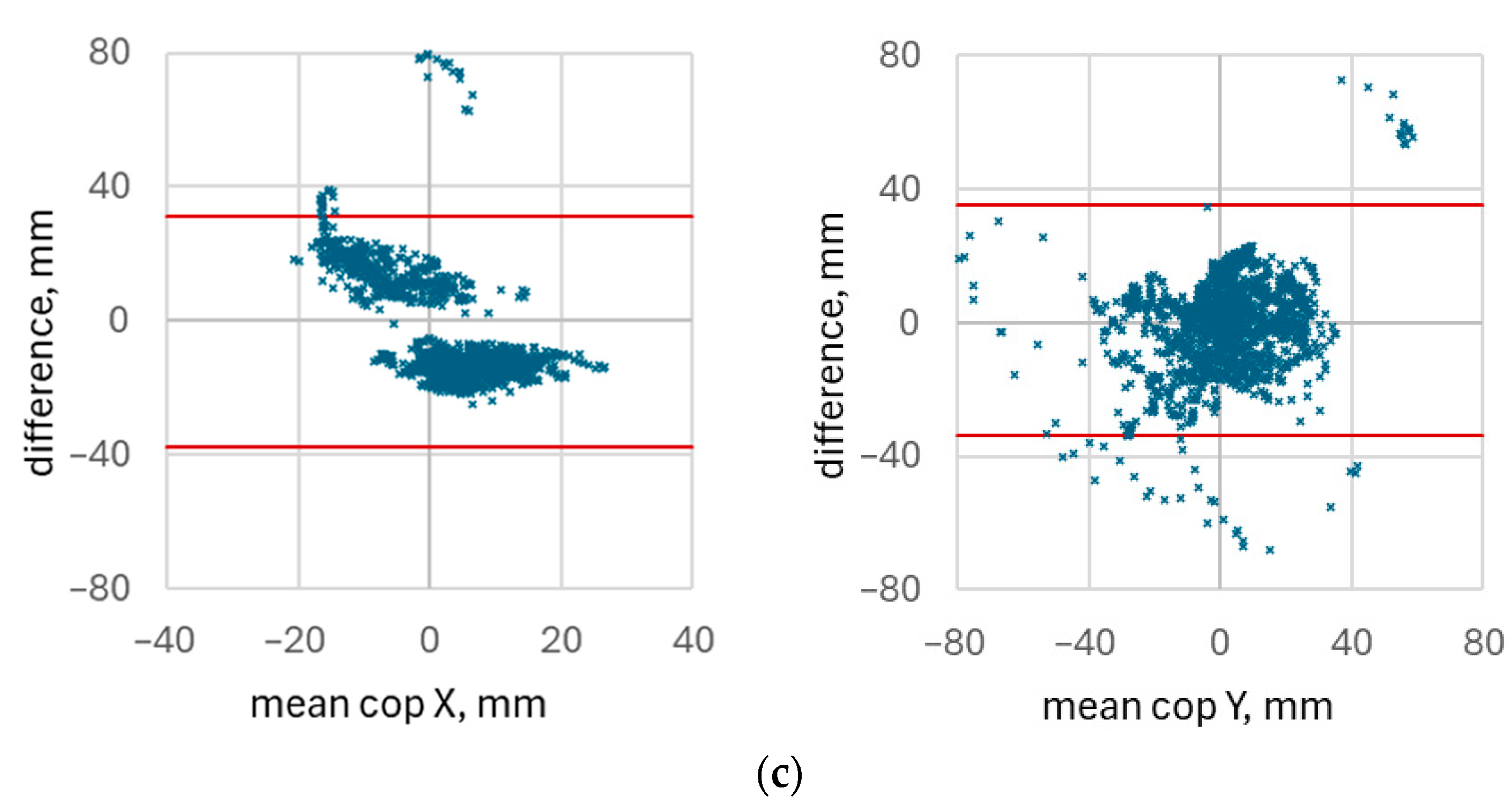 Figure 11 presents examples of the scatter diagrams for both CoP X and CoP Y. These examples correspond to exercises in which the CoP X measurements exhibited the best concordance (CCC = 0.96), median concordance (CCC = 0.73), and the worst concordance (CCC = 0.04).