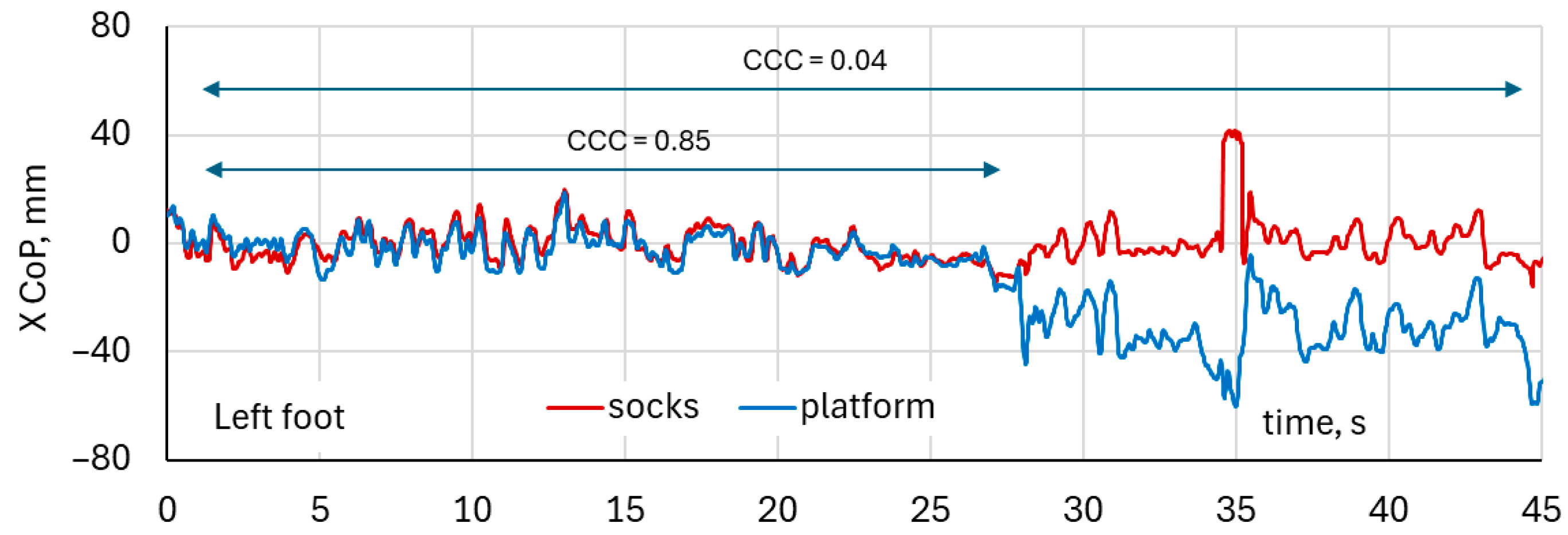It is noteworthy that when only the CoP variation around the baseline is considered (excluding the shift in absolute position) the concordance improves considerably, with CCC increasing to approximately 0.85. This indicates that the socks are able to capture relative changes in CoP dynamics reasonably well, even though they may fail to reproduce abrupt absolute displacements caused by changes in foot placement.