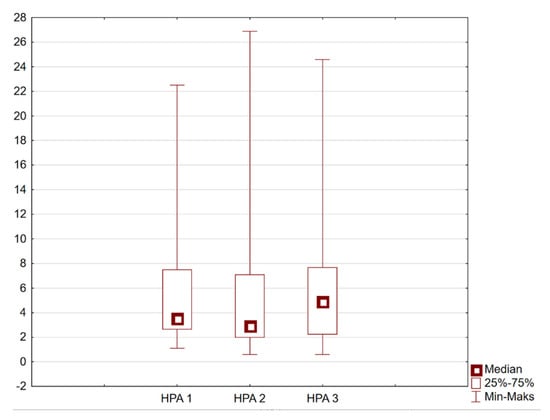 Physical activity levels remained above average across all three measurement points. Although a temporary decrease was observed during Study II, followed by an increase in Study III, these changes were not consistently statistically significant. Figure 1 presents the distribution of the HPA index at three time points (HPA1, HPA2, HPA3), corresponding to Studies I, II, and III, respectively.