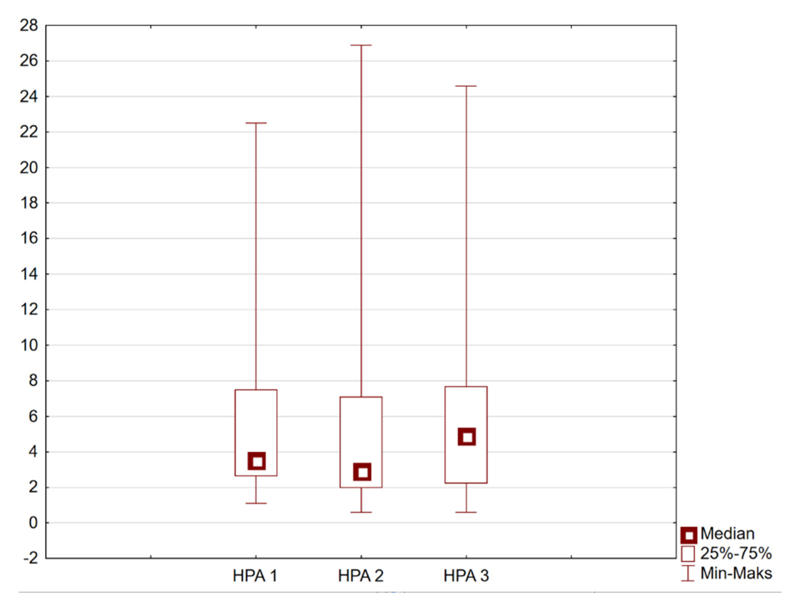 | General activities score (HPA) | W n = 32 | 3.39 2.61 5.36 | 5.23 (1.6–22.51) | 5.06 | 2.73 2.05 4.89 | 4.75 (1.1–26.88) | 5.59 | 3.96 2.22 7.24 | 5.34 (1.8–23.87) | 4.65 | 0.07 |