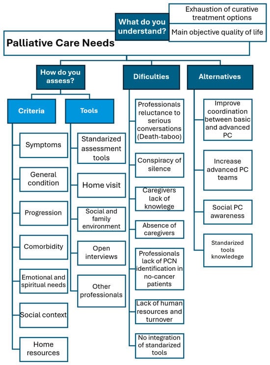 Although none of the participants clearly defined what they understood by PCN, most agreed that patients with PCN are those with cancer or non-cancer diseases who have exhausted all curative treatment options. At this point, the main objective becomes the quality of life of both the patient and their family. One interviewee emphasized that PC should begin as soon as an incurable disease is diagnosed, without waiting for the patient to reach the terminal stage.