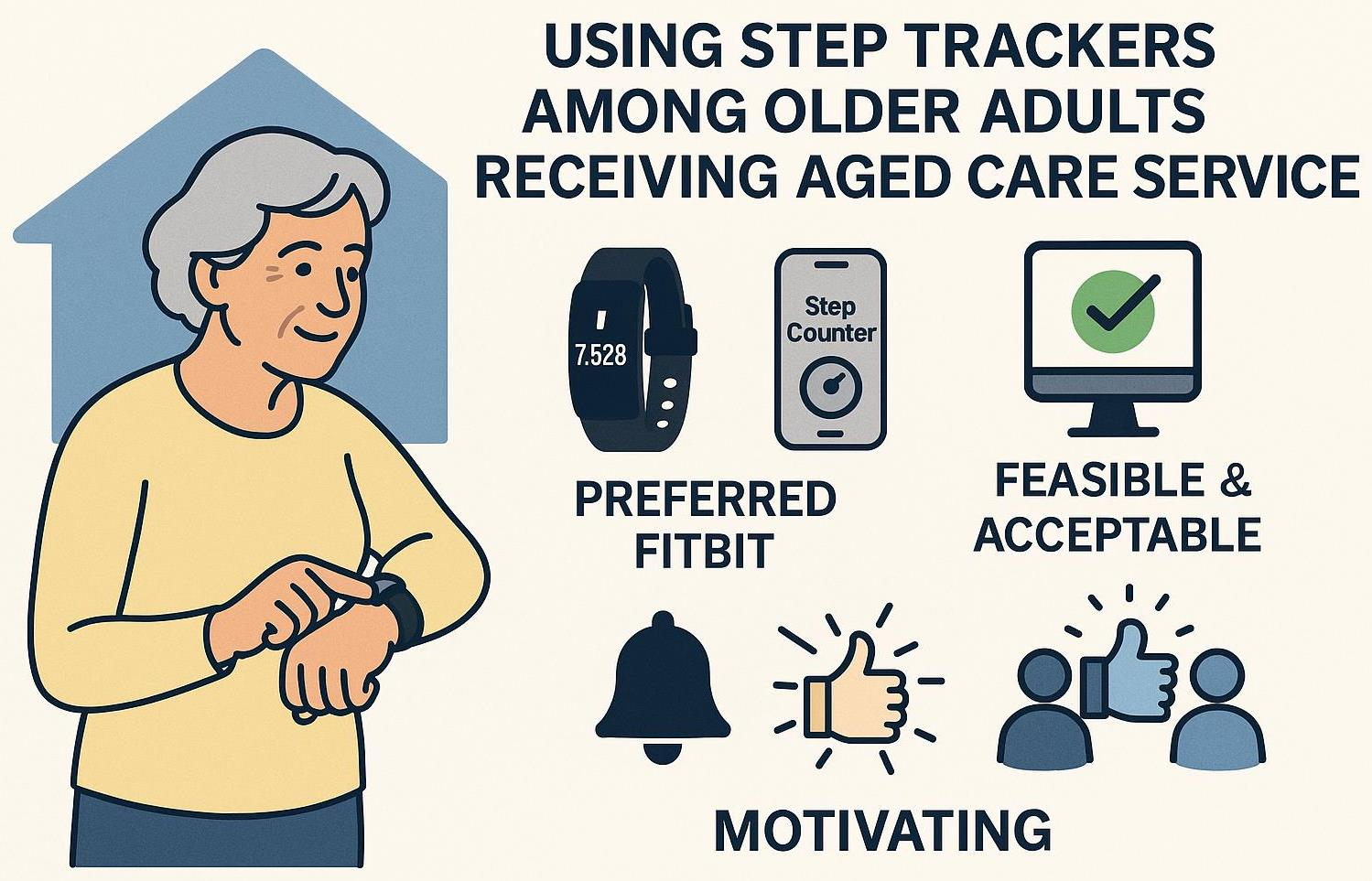 - Step tracking was feasible and acceptable for older adults receiving aged care, with strong engagement and a clear preference for Fitbit devices over phone or website interfaces.
