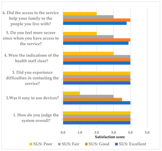 Overall, patients who rated SUS as poor scored lower on the satisfaction questionnaire (median value 14), while those who rated SUS as good/excellent scored higher (median values 23.5 and 24, respectively). Patients in the fair group had a mean satisfaction questionnaire score of 20.5, indicating a “fairly satisfied” rating.