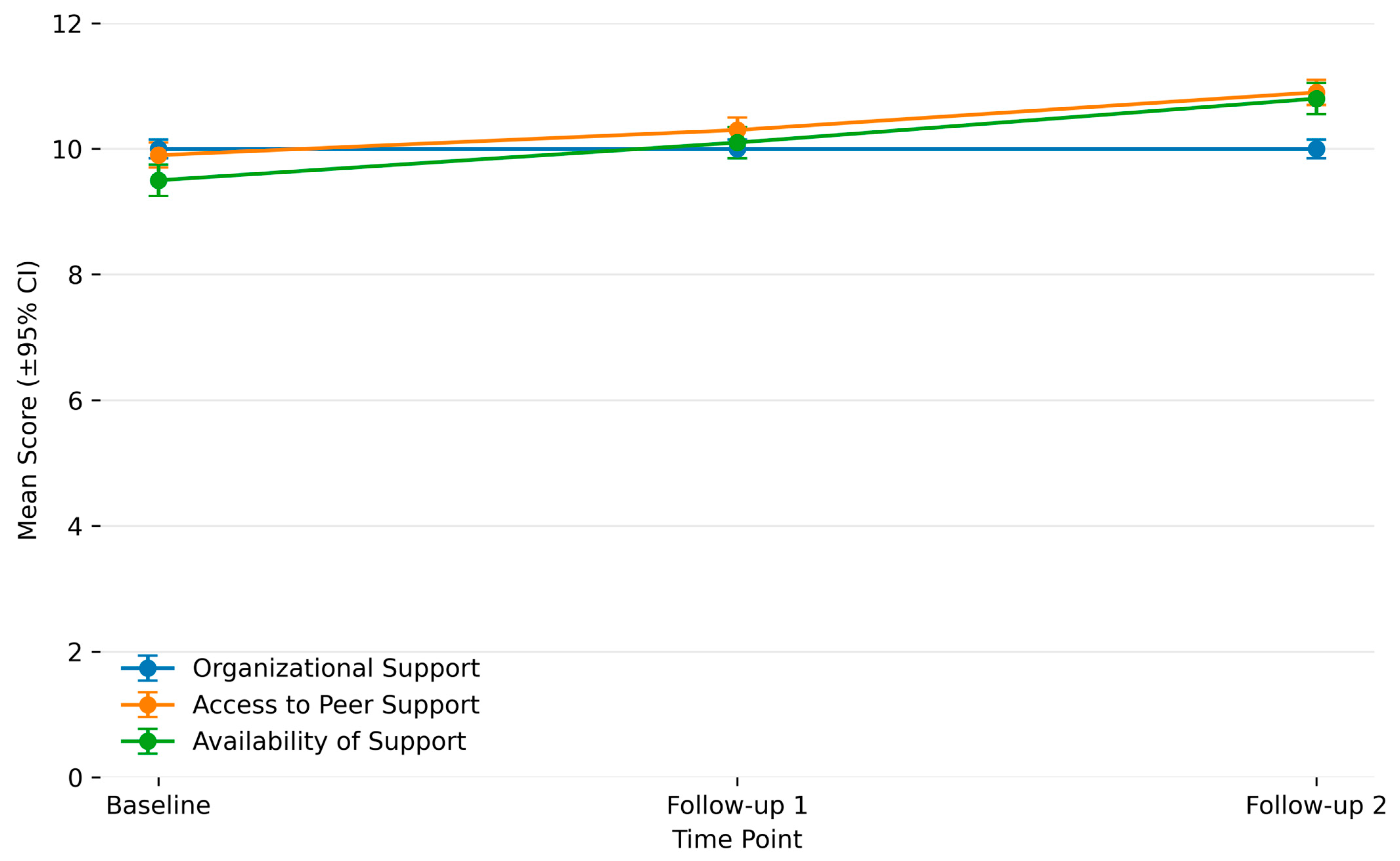 | Organizational Support | 9.03 (2.04) | 9.15 (2.33) | 8.97 (2.05) | −0.05 | 0.03 |