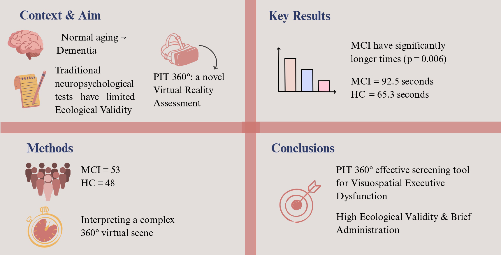 Given these premises, the PIT 360° represents a promising candidate for MCI screening, as it combines ecological validity with the ability to assess complex executive functions in an immersive yet controlled environment. However, despite encouraging findings from studies demonstrating its utility as a diagnostic screening tool in other clinical populations, no research has yet examined its application specifically in individuals with MCI.