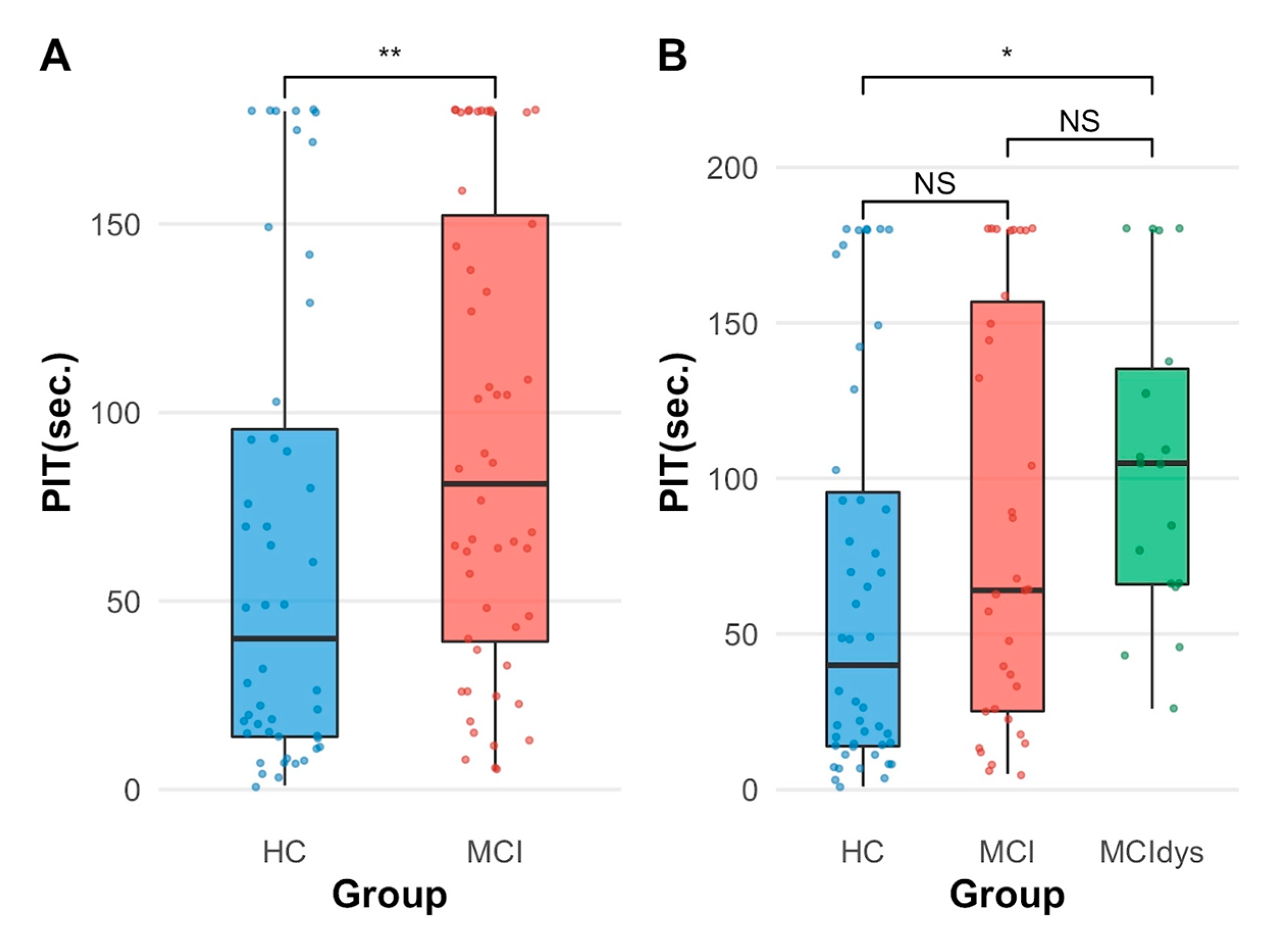 A Kruskal–Wallis test was conducted due to sample size imbalances to examine differences in PIT completion time scores across three groups: HCs, MCI without executive dysfunction (MCI), and MCIdys. The test revealed significant group differences, χ2(2) = 8.24, p = 0.016.