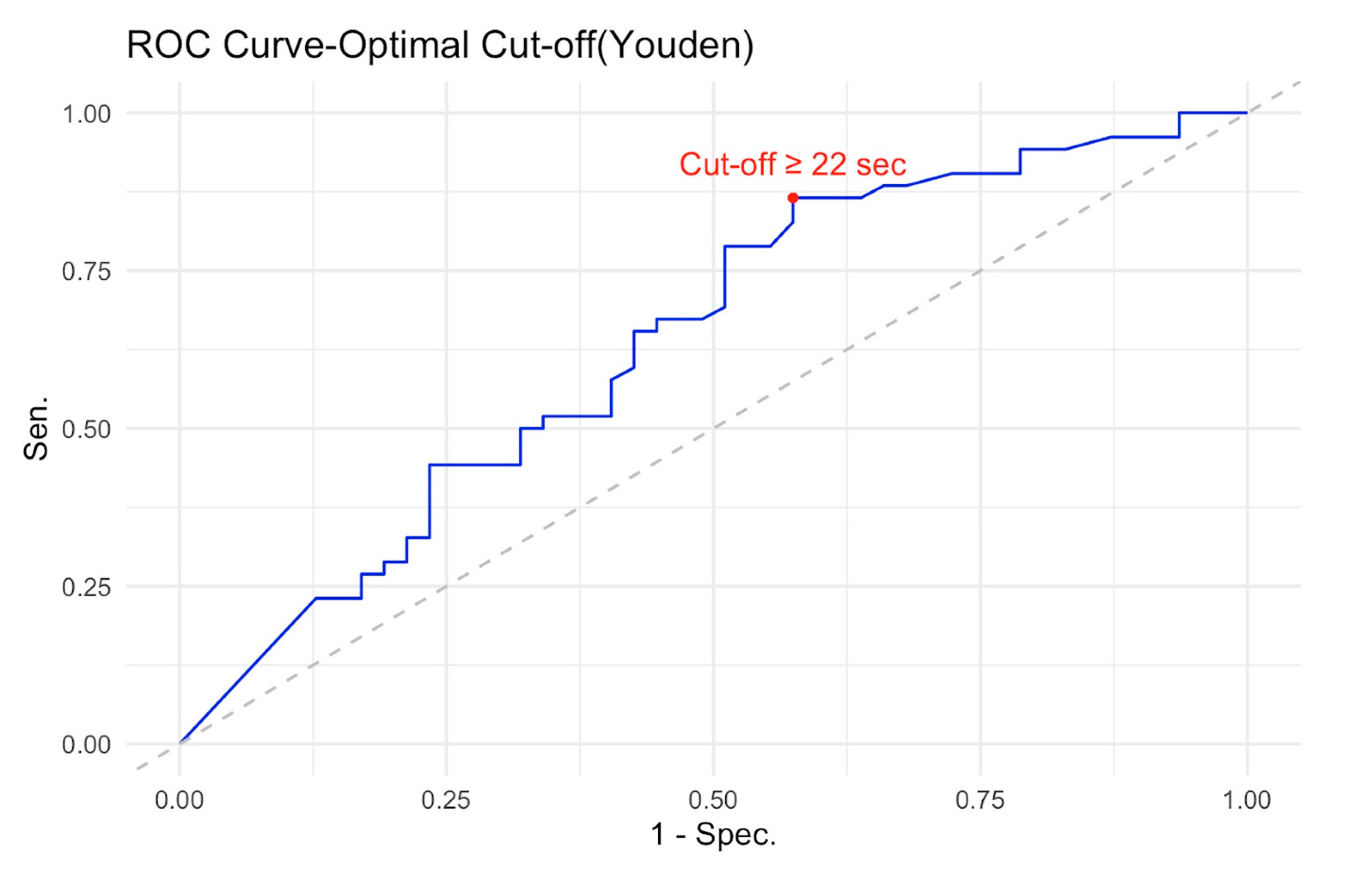 28]. Using Youden’s index to determine the optimal classification threshold, a predicted probability cut-off of 0.43 was identified, corresponding to a PIT 360°_completion time score of 22 s. The decision rule derived from this analysis suggests that PIT 360°_completion time scores ≥ 22 s indicate an increased likelihood of MCI classification, whereas scores < 22 s suggest a healthy cognitive status (see