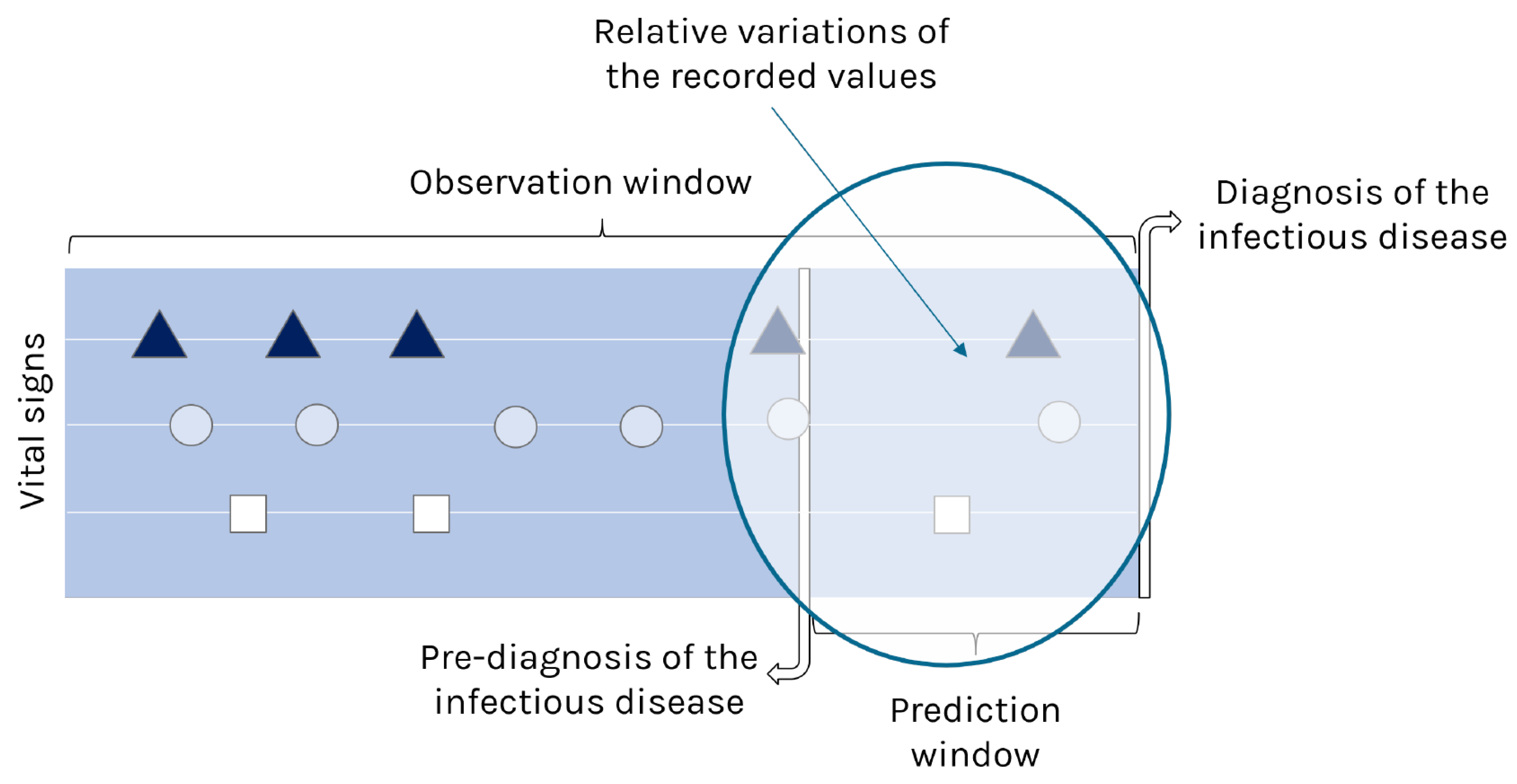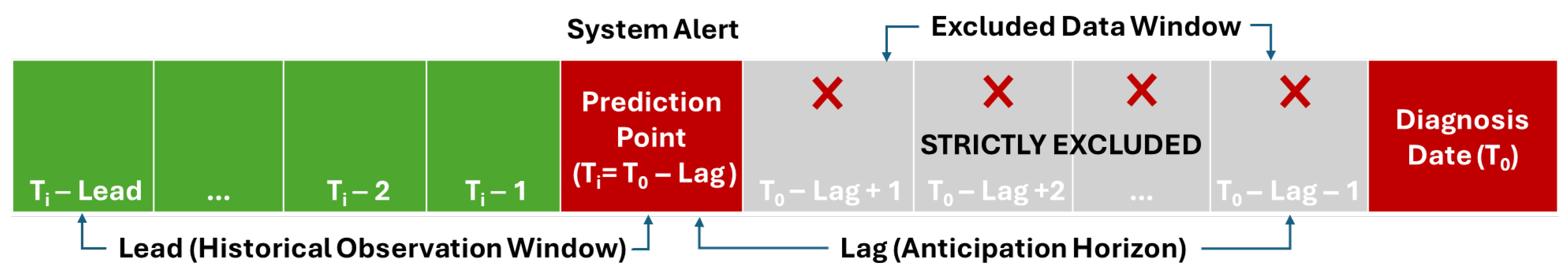 - Lag (Anticipation Horizon): The Lag is defined as the number of days prior to that the system aims to anticipate the infection. This creates a “Prediction Point” at . To guarantee that the model does not “peek” into the future, all physiological data occurring between the Prediction Point () and the Diagnosis Date () are strictly excluded from the feature extraction process. This ensures the model only reacts to early, subtle variations rather than the overt clinical deterioration that immediately precedes diagnosis.